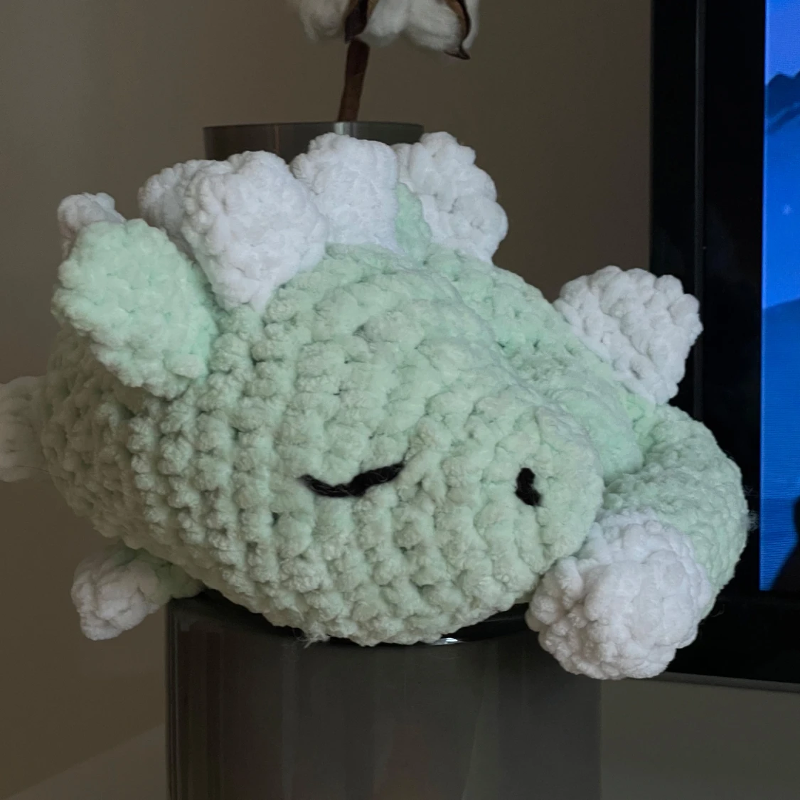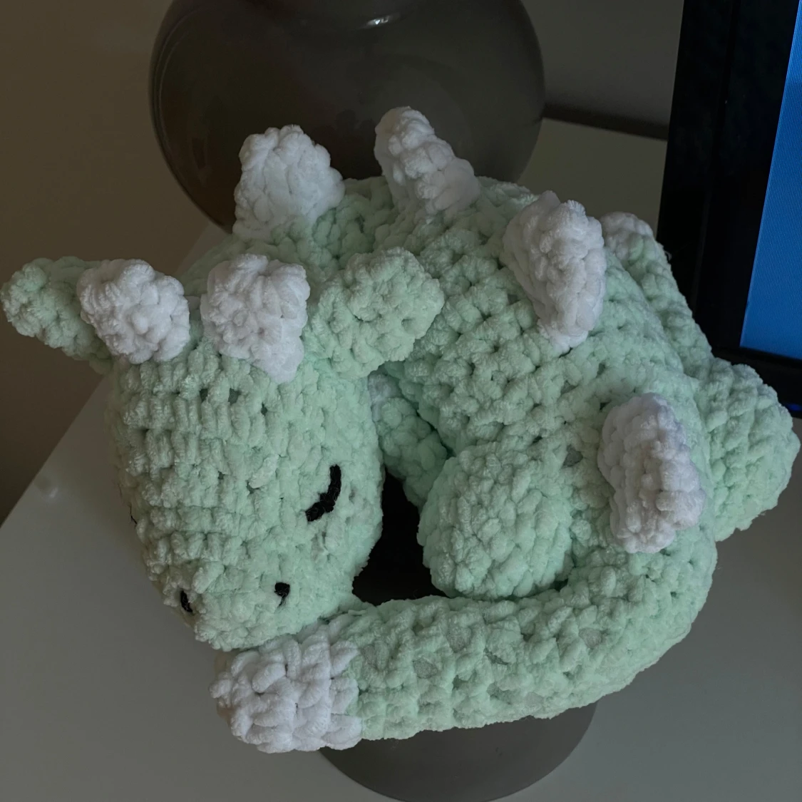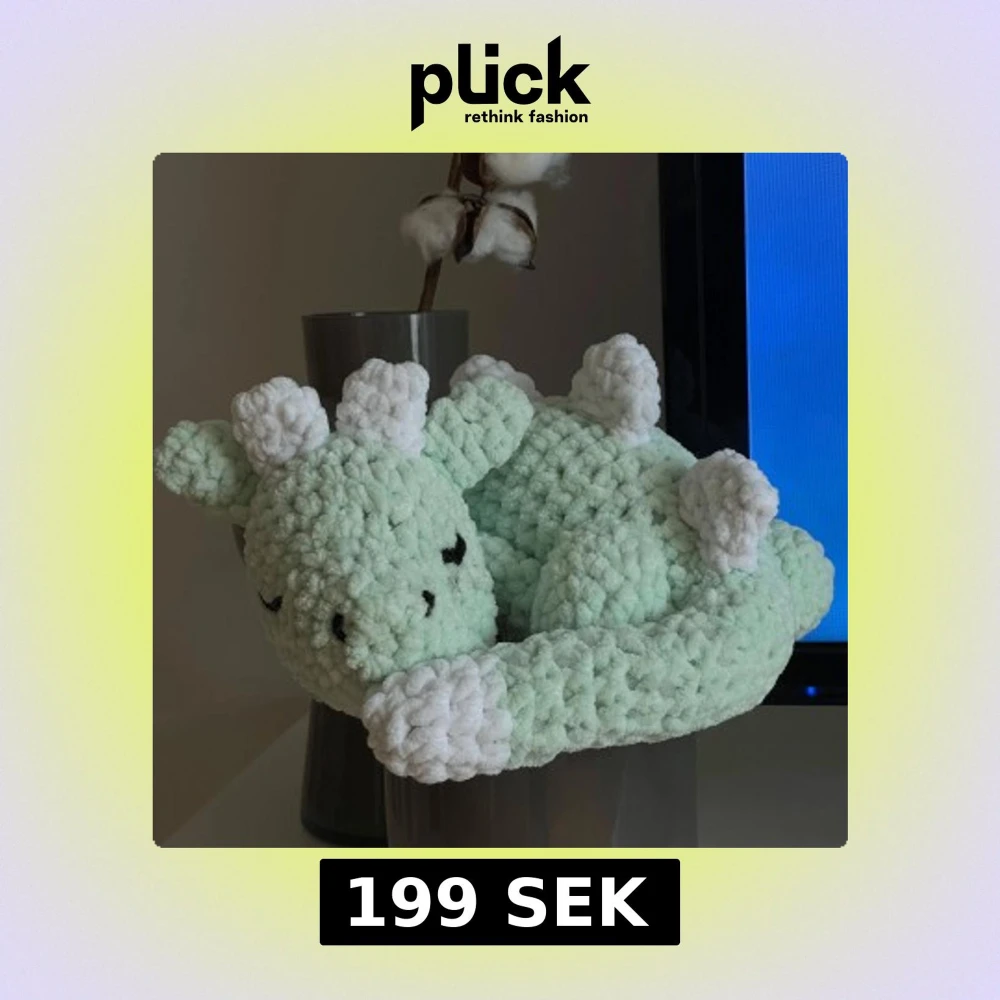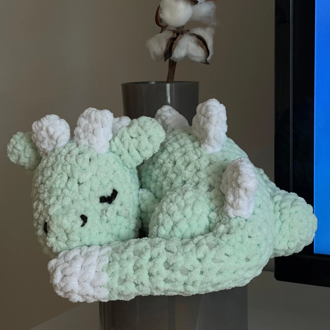 En söt, handvirkad drake i mintgrön och vitt garn. Den är mjuk och fluffig, perfekt som dekoration eller gosedjur. Lokalt inköpt garn och verktyg🧸 Drakens storlek: 25x22cm