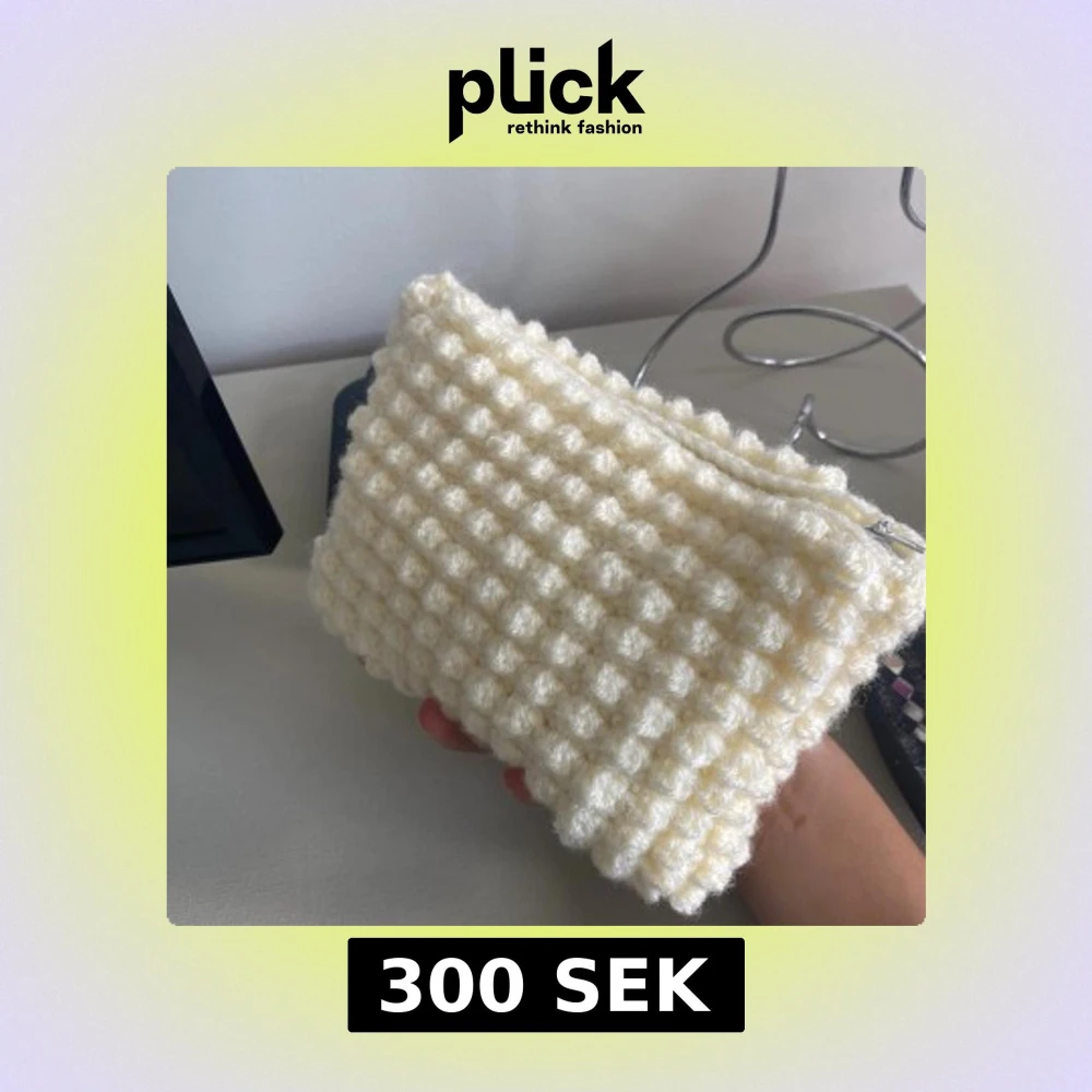 Superfin handgjord neccesär i virkat material med bubblig struktur. Necessären är smörfärgad och har en dragkedja upptill samt vitt innerfoder. Perfekt för att förvara småsaker eller smink. Går även att använda som handväska. Egenvirkad!!💕