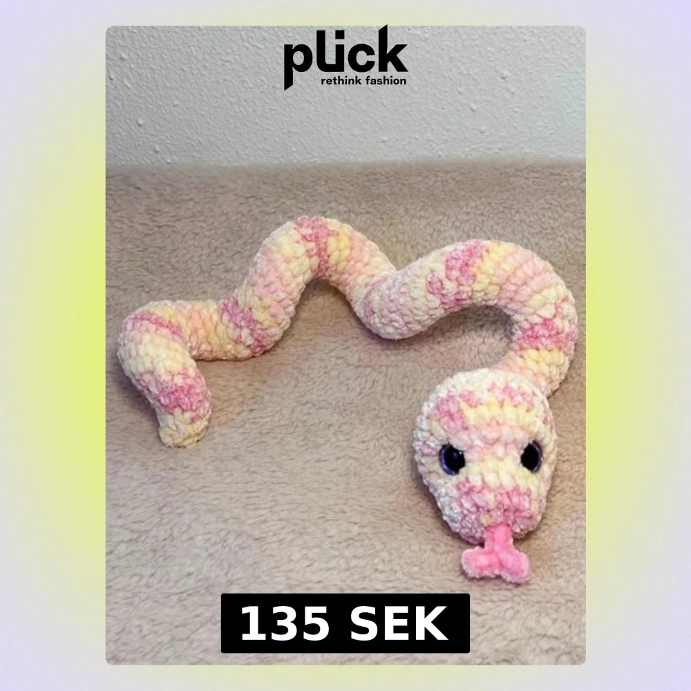 En virkad orm, den Ă€r stoppad med fyllnadsvadd och har sĂ€kerhetsögon đ