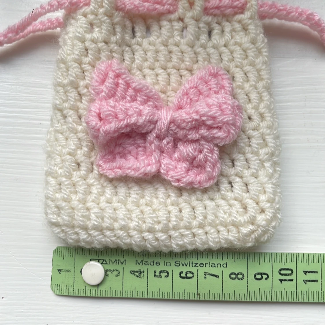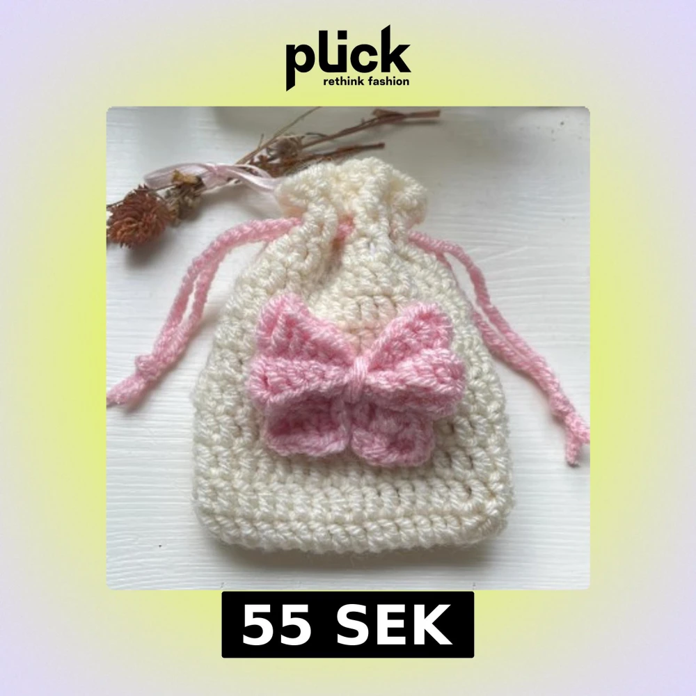 Virkad drawstring pouch med rosett och tyg inuti. Perfekt för AirPods eller att ha smycken i💕