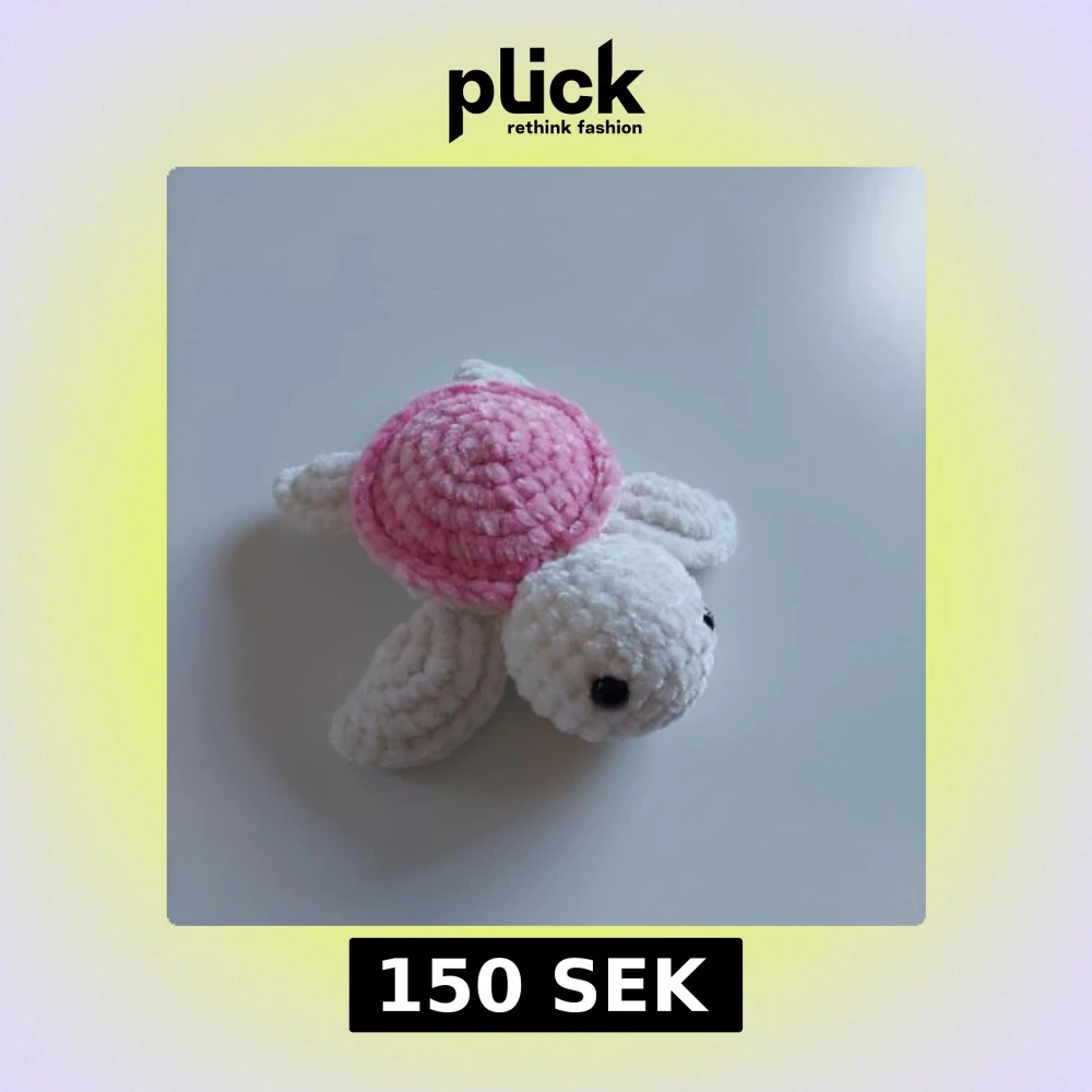 Virkad sköldpadda i färger vit och rosa. Sköldpaddan är ca 20 cm lång 🩷