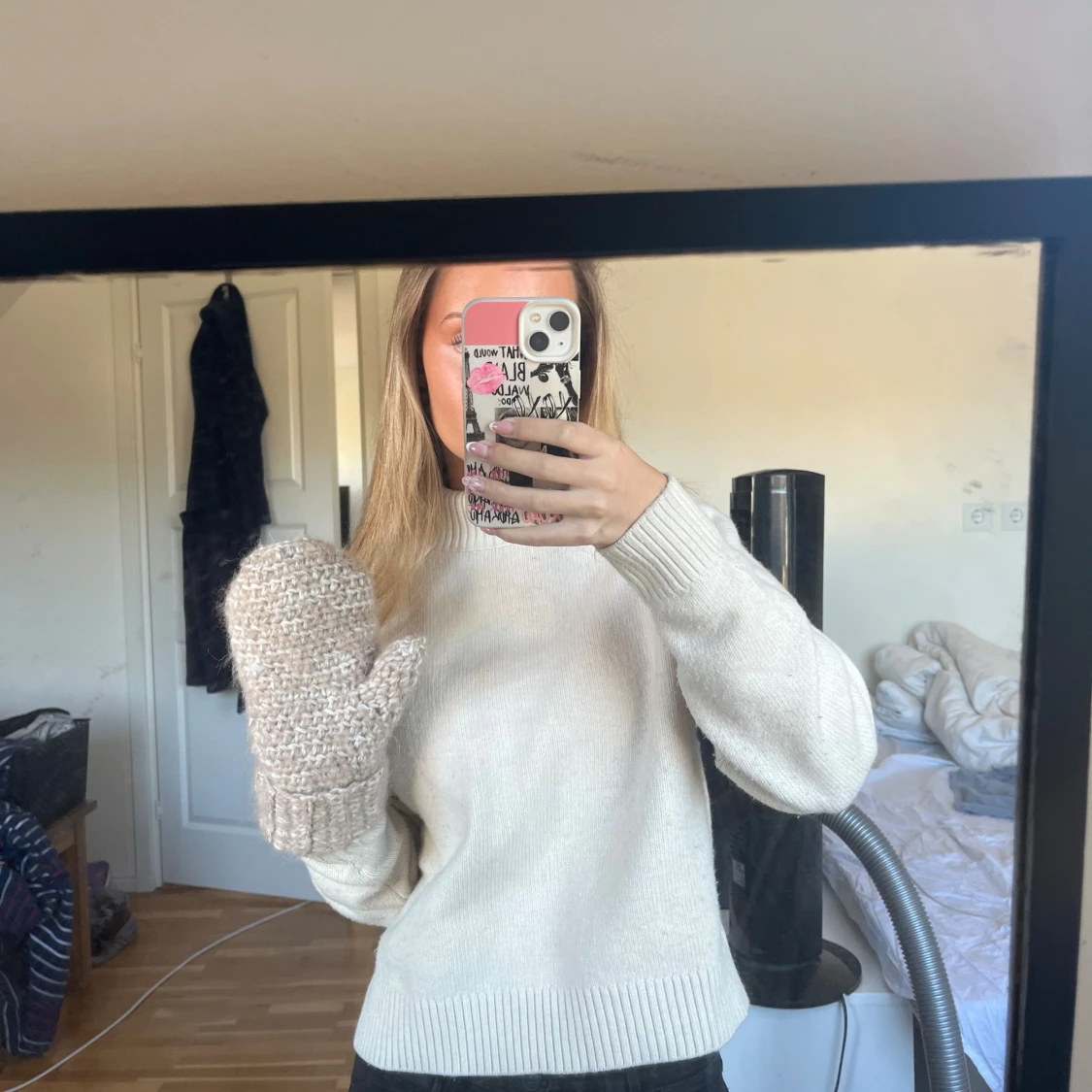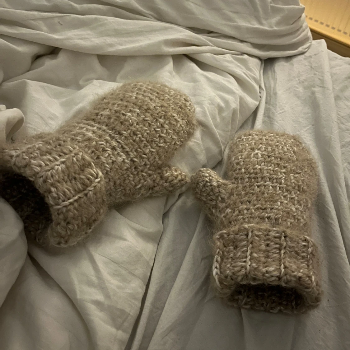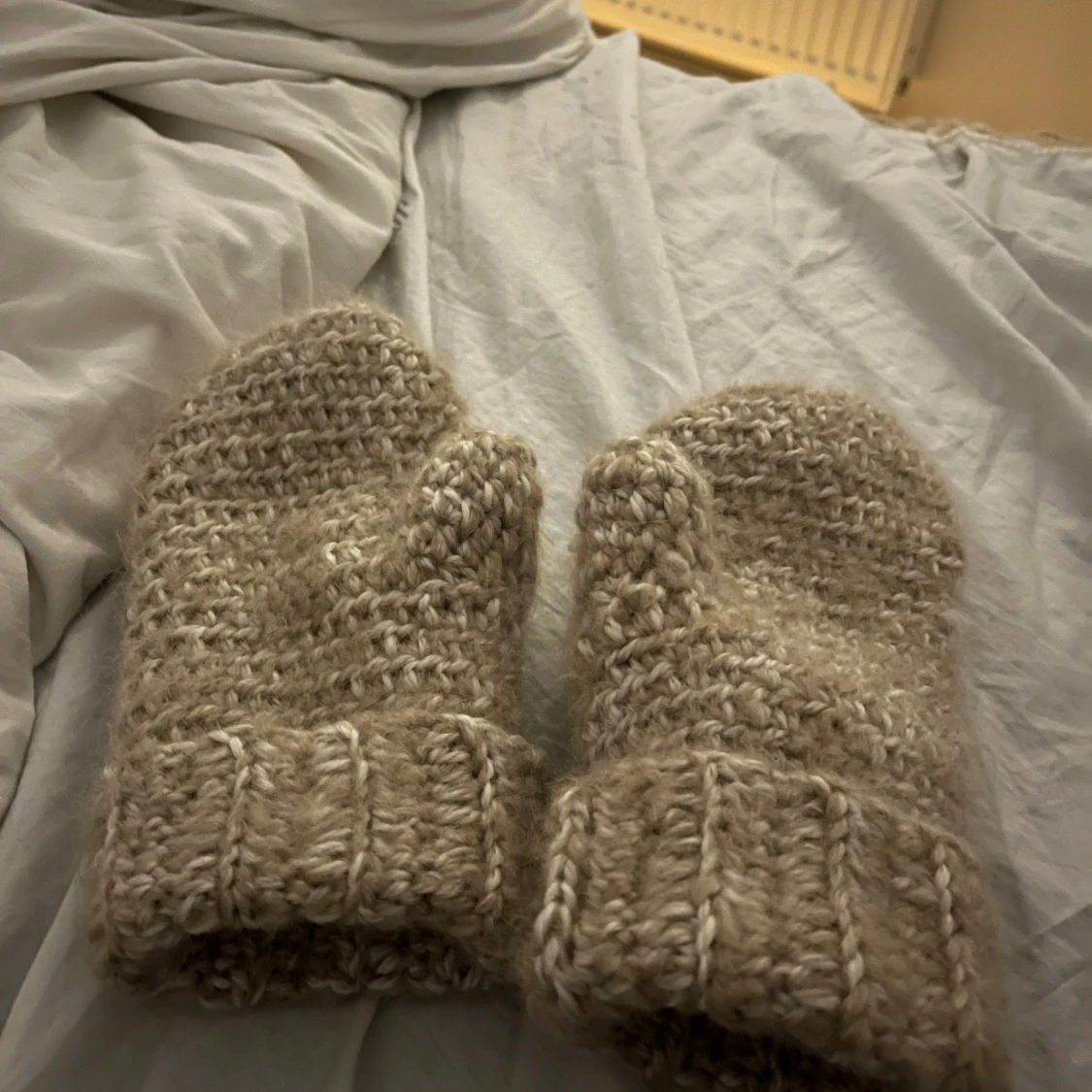 Säljer ett par virkade tumvantar i beige färg. De är virkade av mig med alpacka & mohair garn vilket gör de jätte varma. Perfekta för kalla dagar när du vill hålla händerna varma och ändå se stilren ut.