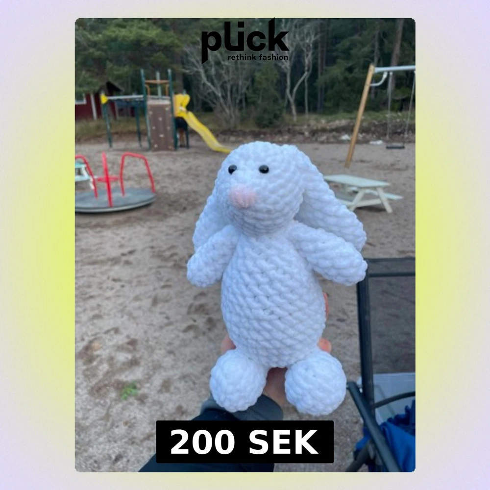 Vit virkad kanin. Har pålimmade plastögon så rekommenderas inte för barn under 3år. Kan sitta upp om den lutas mot en vägg eller liknande. Jämför storleken med min hand eller fråga annars om mer exakta mått 🫶🏻följ gärna mig på TikTok: Crochet by matti
