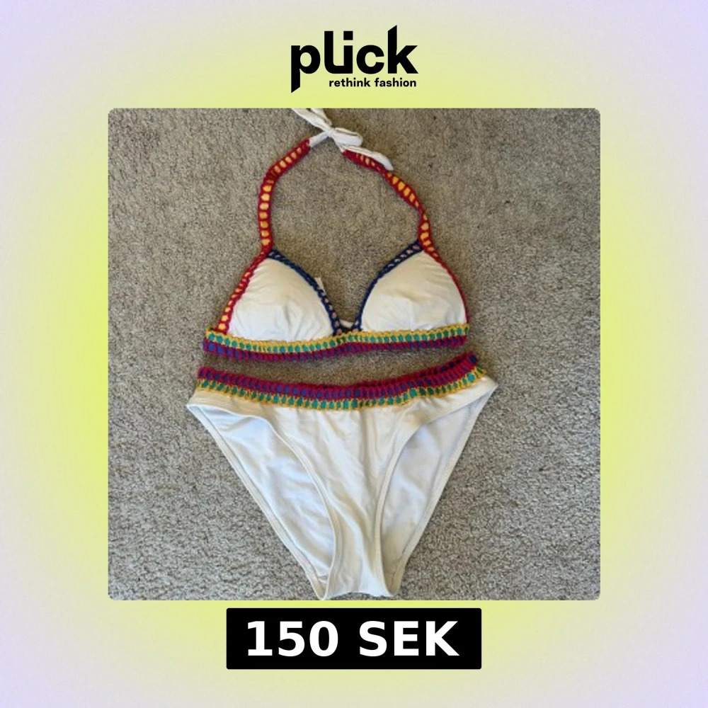 Säljer en snygg vit bikini från Hunkemöller med färgglada virkade detaljer i rött, gult och blått. Bikinin har knytband i nacken och en bekväm passform. Perfekt för sommarens alla badäventyr! 🌞