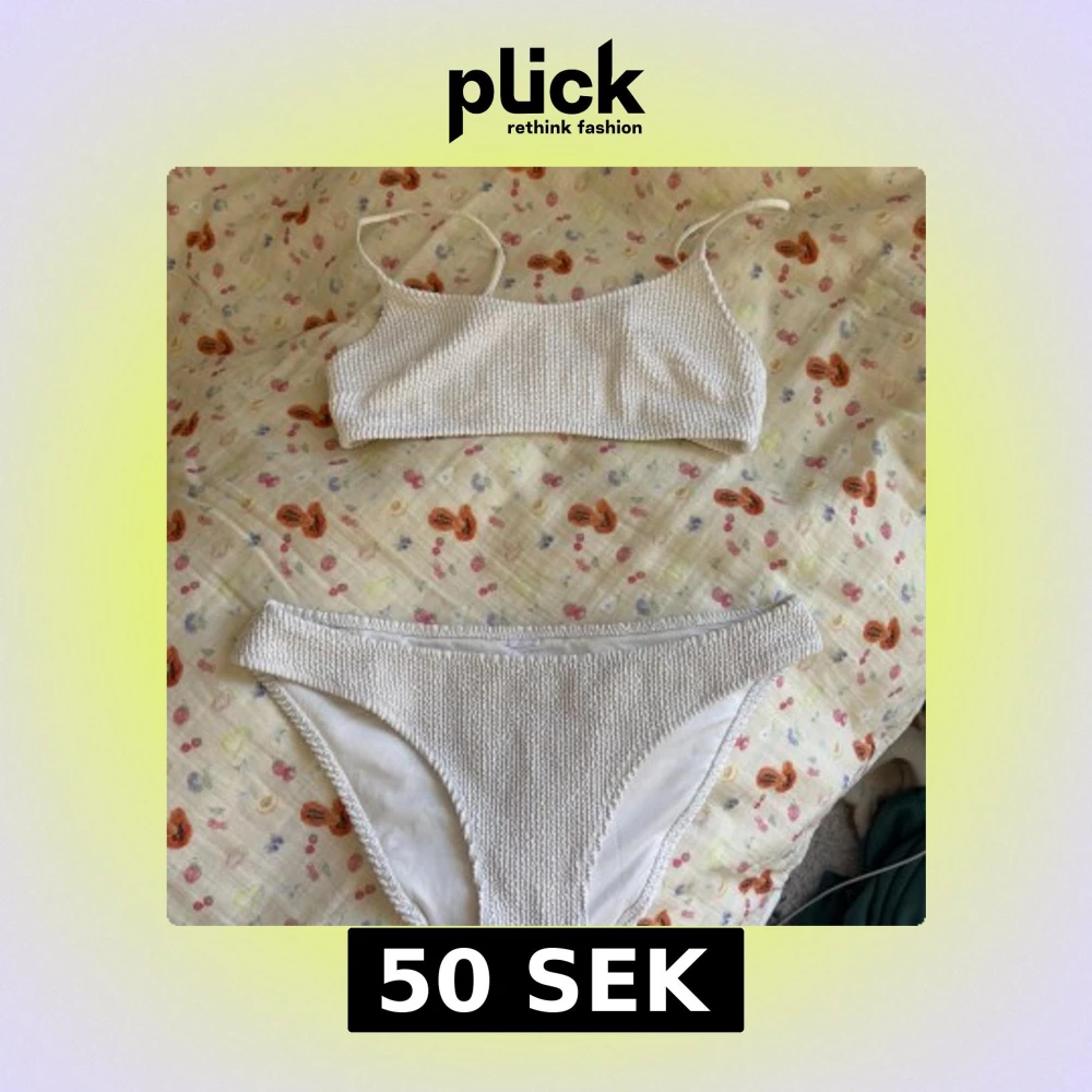 Säljer en vit bikini med ribbad struktur och smala axelband. Både överdel och underdel har en enkel och stilren design. Perfekt för stranden eller poolen i sommar!