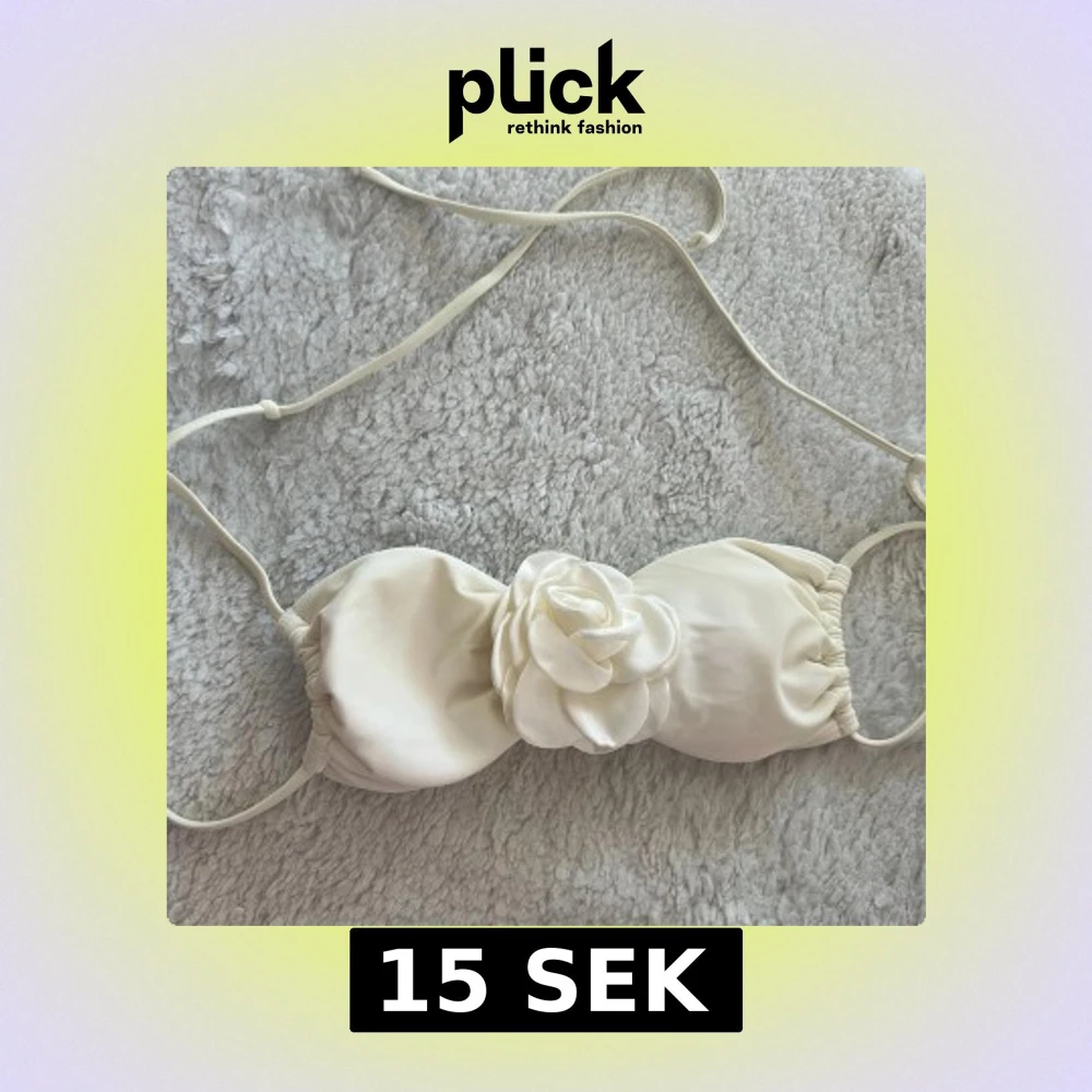 Superfin vit bikiniöverdel med en stor, elegant blomdetalj i satinliknande material mitt fram. Bandeau-modell med tunna knytband som ger en clean och stilren look. Perfekt för dig som vill sticka ut på stranden i sommar!