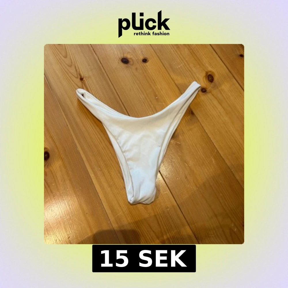 Snygg vit bikiniunderdel från SHEIN i ribbad design. Modellen har höga ben och V-formad skärning som ger en trendig look. Materialet är mjukt och stretchigt, tillverkat av 82% polyester och 18% elastan. Perfekt för strandhäng och poolparty i sommar!