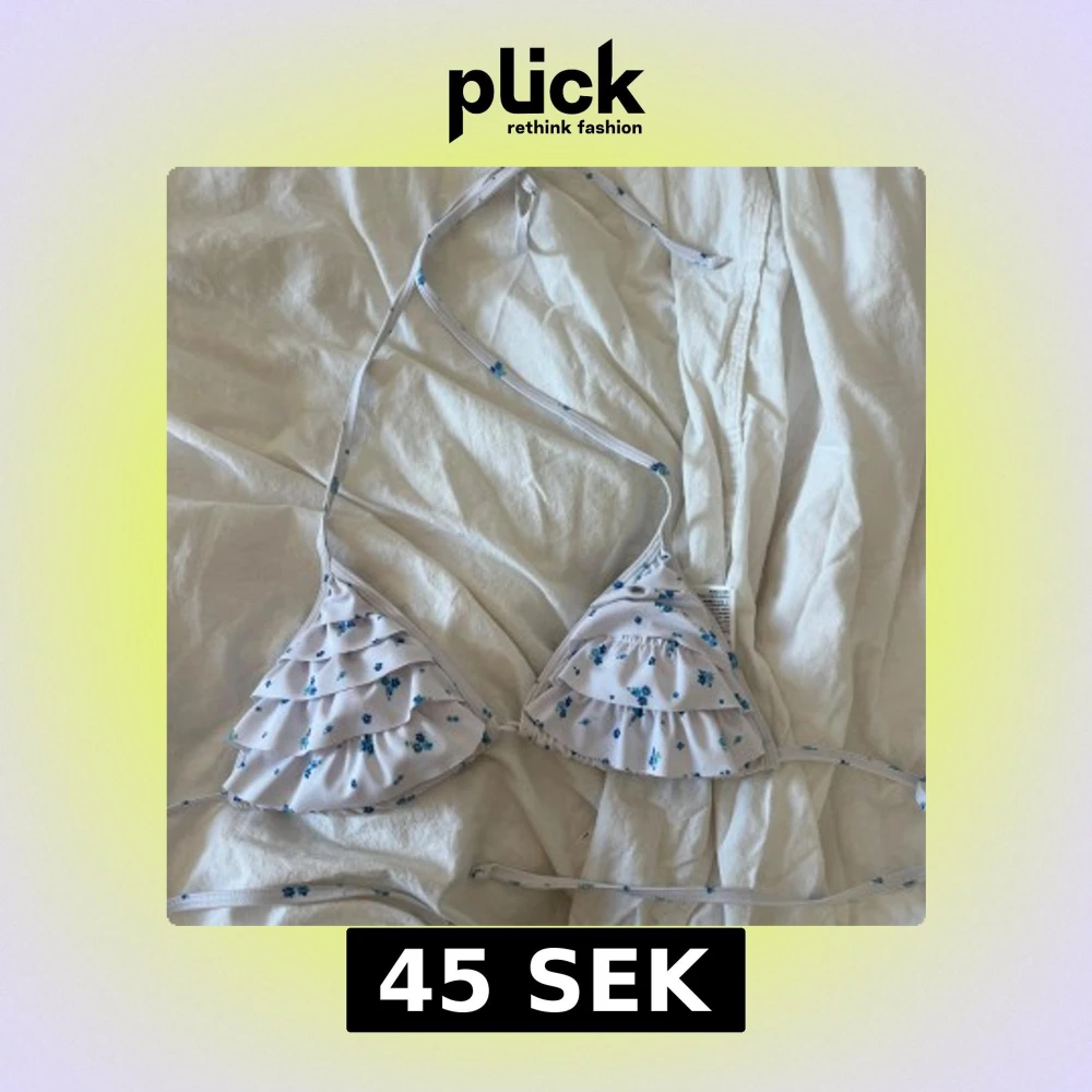 Supersöt trekantsbikini i vitt med små blå blommor och volangdetaljer på kuporna. Knytband i nacken och ryggen , aldrig använd