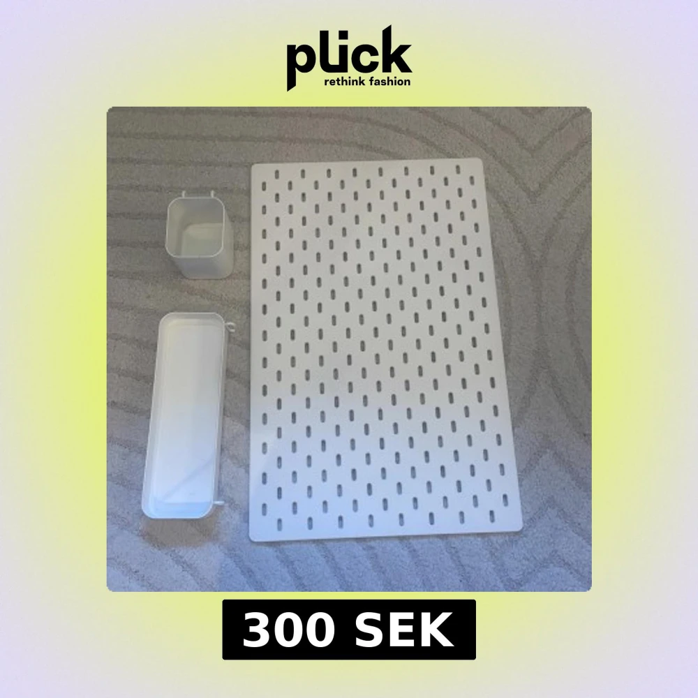 Säljer en vit perforerad förvaringspanel med två tillhörande behållare, perfekt för att organisera småsaker. Panelen har ett modernt och stilrent utseende och är tillverkad i tålig plast. Passar bra i både sovrum och kontor för smart förvaring.