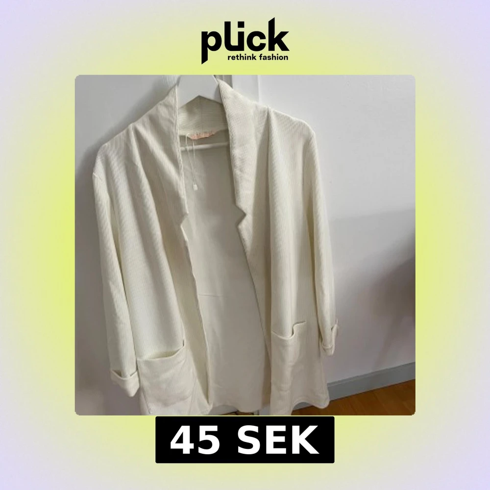 Säljer en stilren vit blazer från AIREY med diskret ribbad struktur. Blazern har lång ärm, två framfickor och öppen front utan knappar. Perfekt för dig som gillar minimalistisk och clean look. Passar dig som vill ha en enkel men snygg blazer.