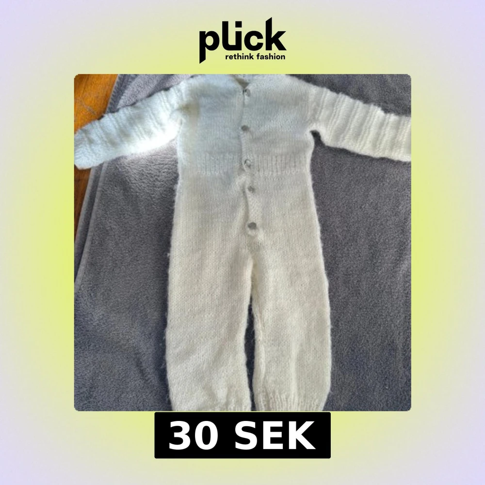 Mysig vit stickad byxdress med långa ärmar, huva och knappar framtill. Perfekt för kalla dagar och superbekväm att chilla i. Byxdressen är ribbstickad vid ärmslut och benslut för extra komfort.