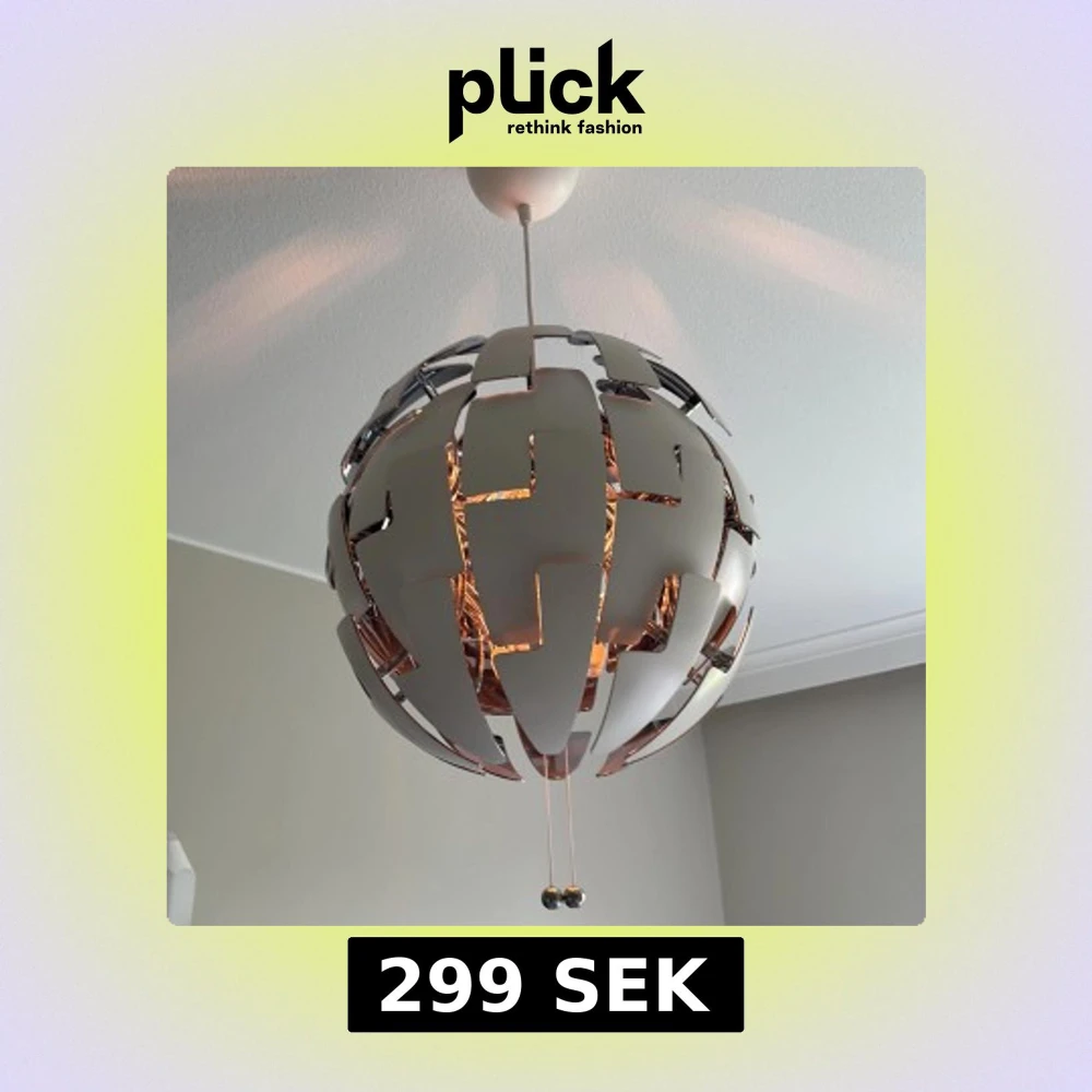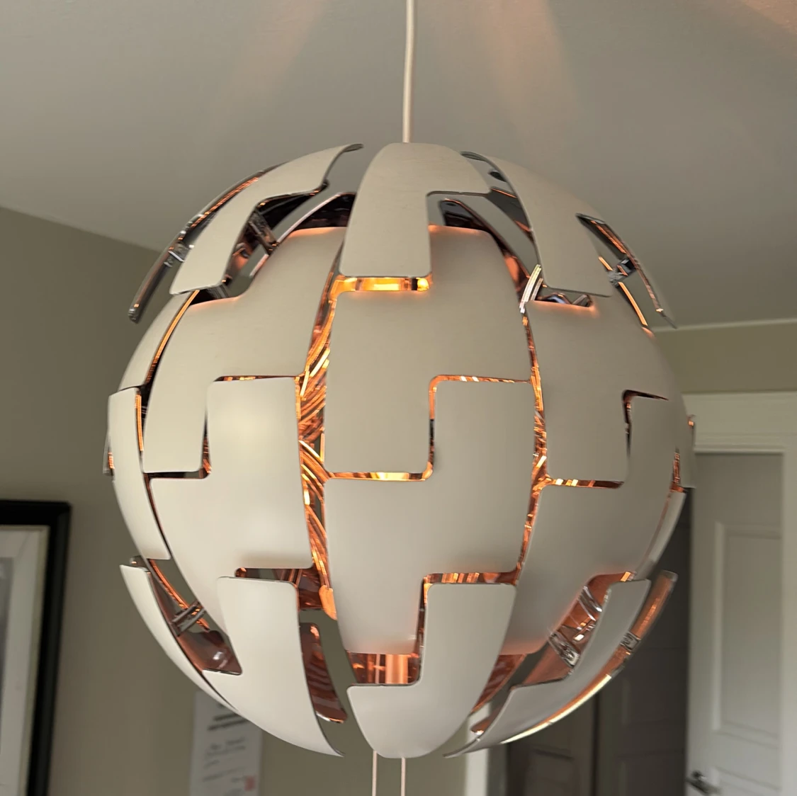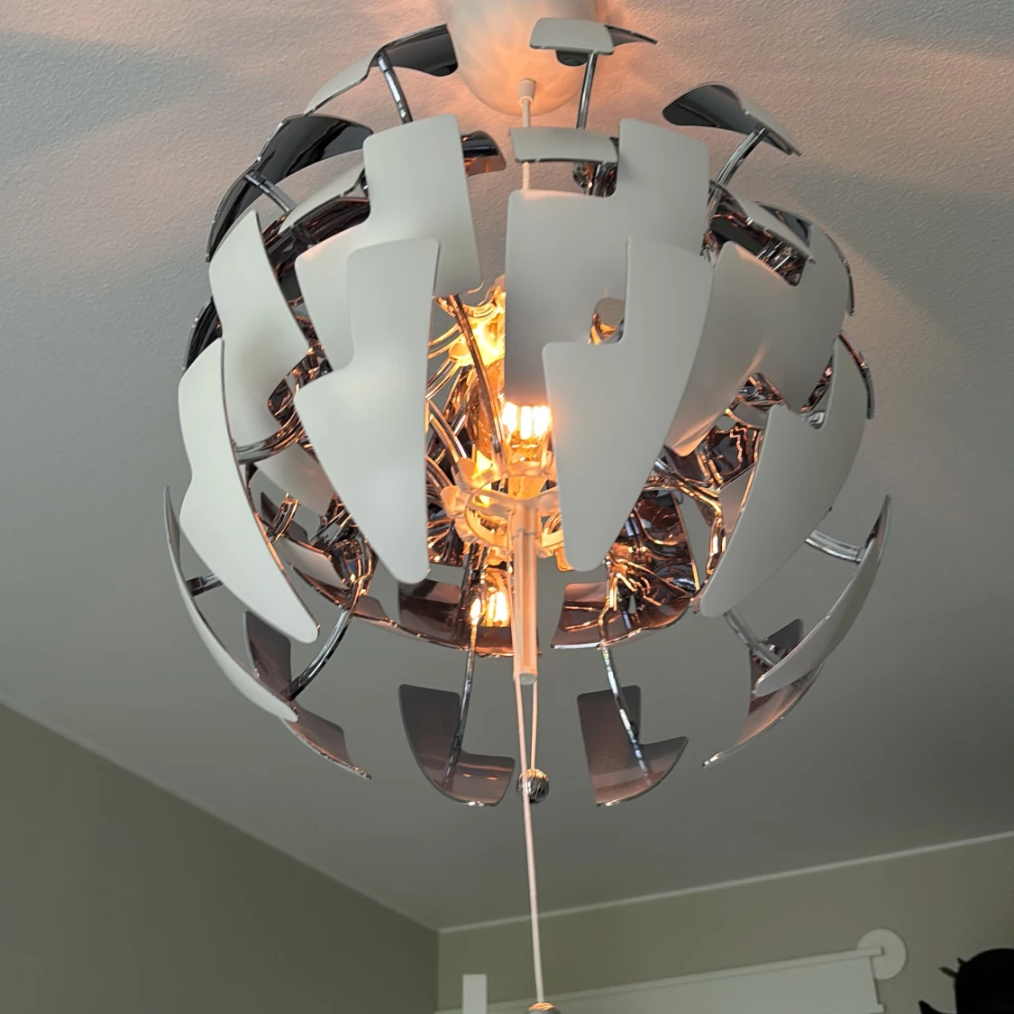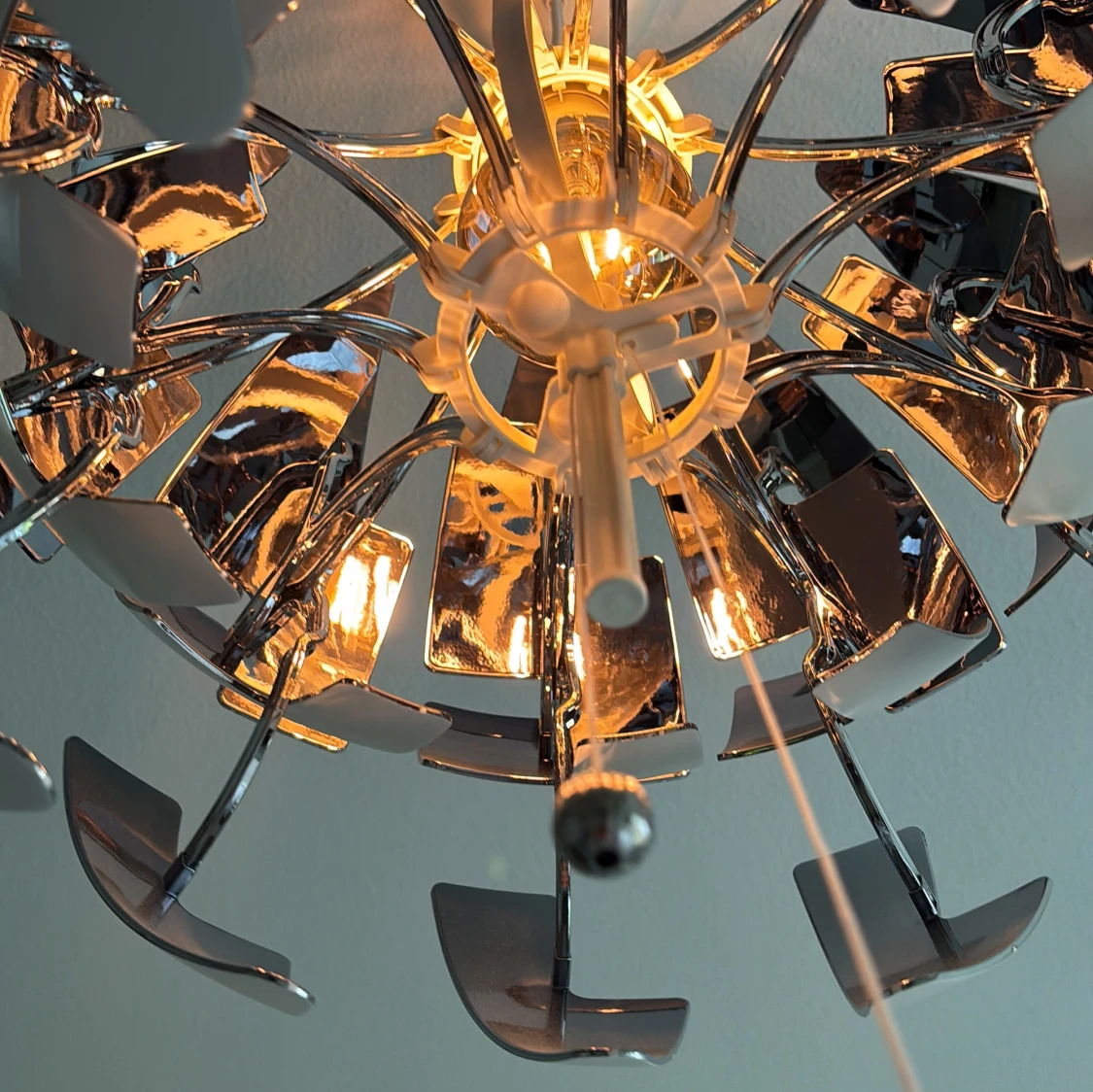 Bilderna visar en modern taklampa med ett unikt, sfäriskt och futuristiskt designmönster. Lampan har vita och silvriga segment som kan öppnas och stängas, vilket skapar en cool ljuseffekt. Perfekt för dig som vill ha en iögonfallande inredningsdetalj i ditt rum.