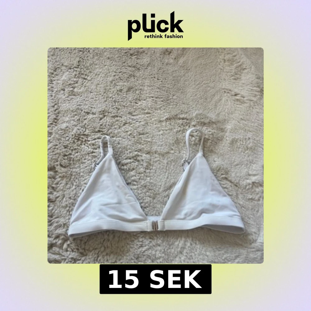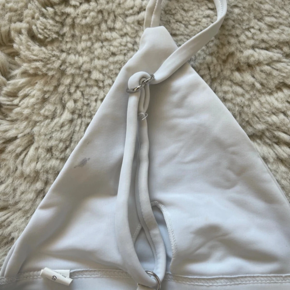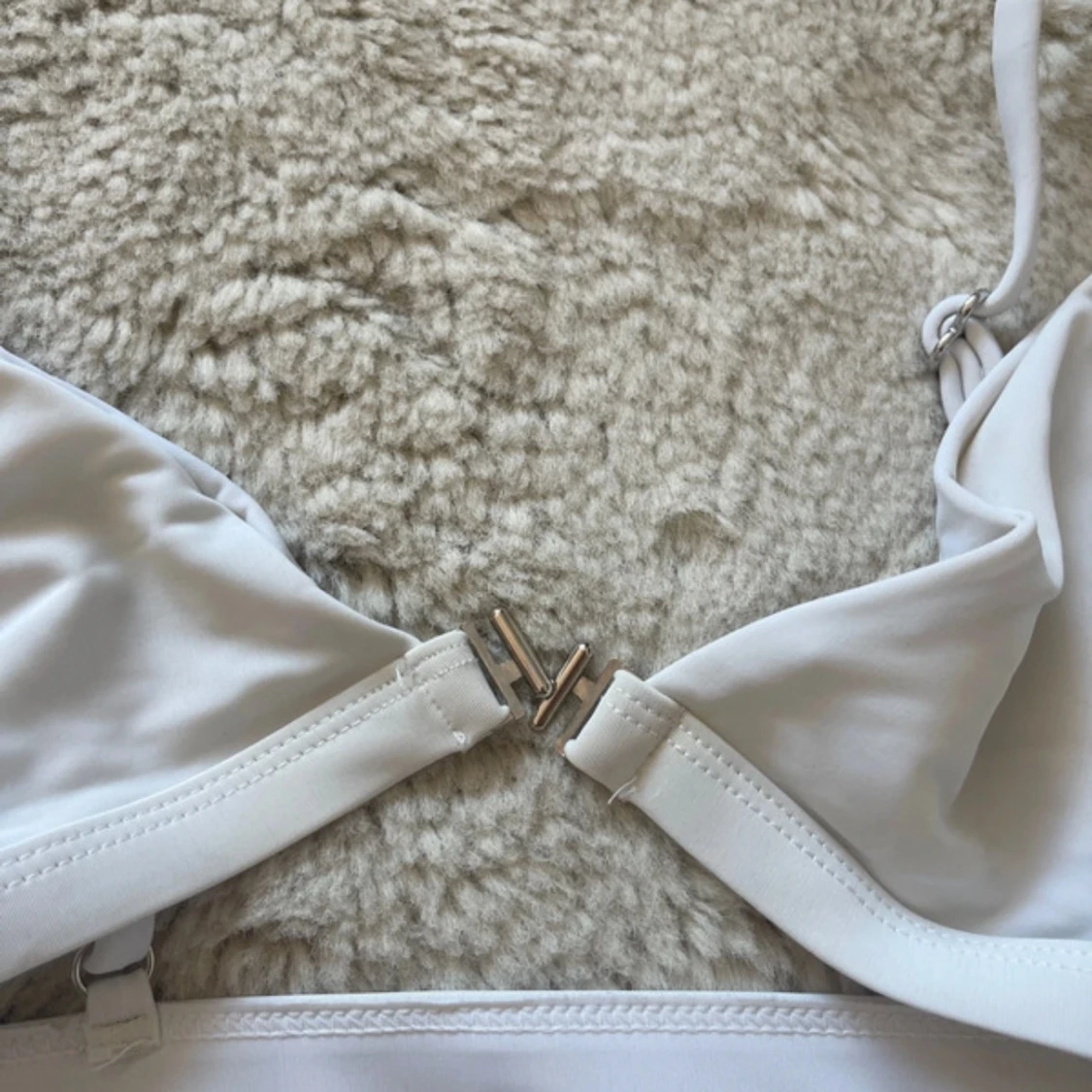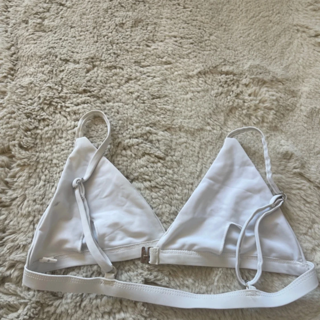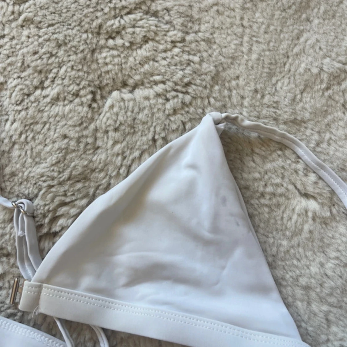 Vit trekantsbikini med smala, justerbara axelband och metallspänne i ryggen. Klassisk och stilren modell med mjukt tyg och enkel design, perfekt för strandhäng eller poolen. Från shein. Finns små fläckar på ena sidan. Se bilder. Storlek S men sitter som en Xs