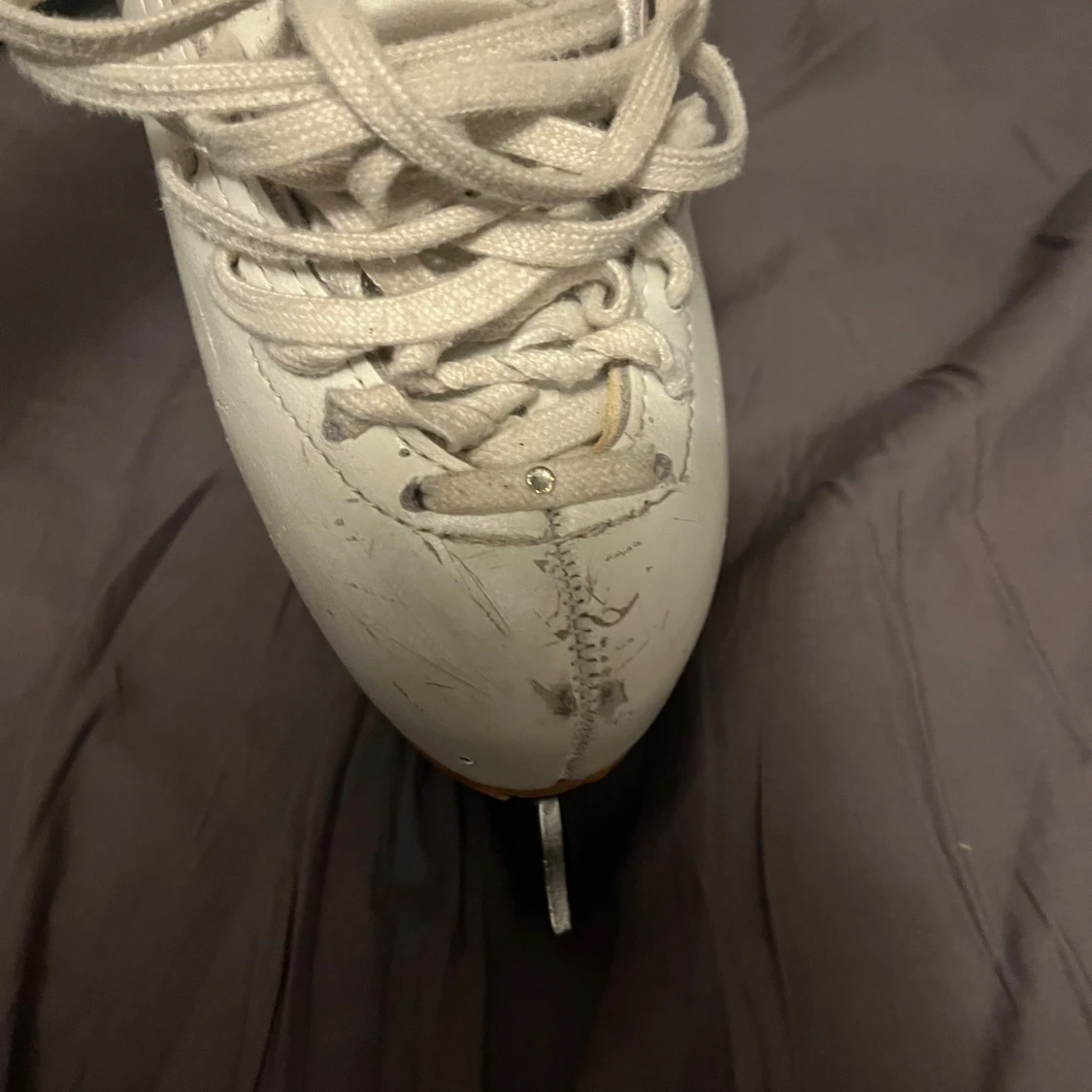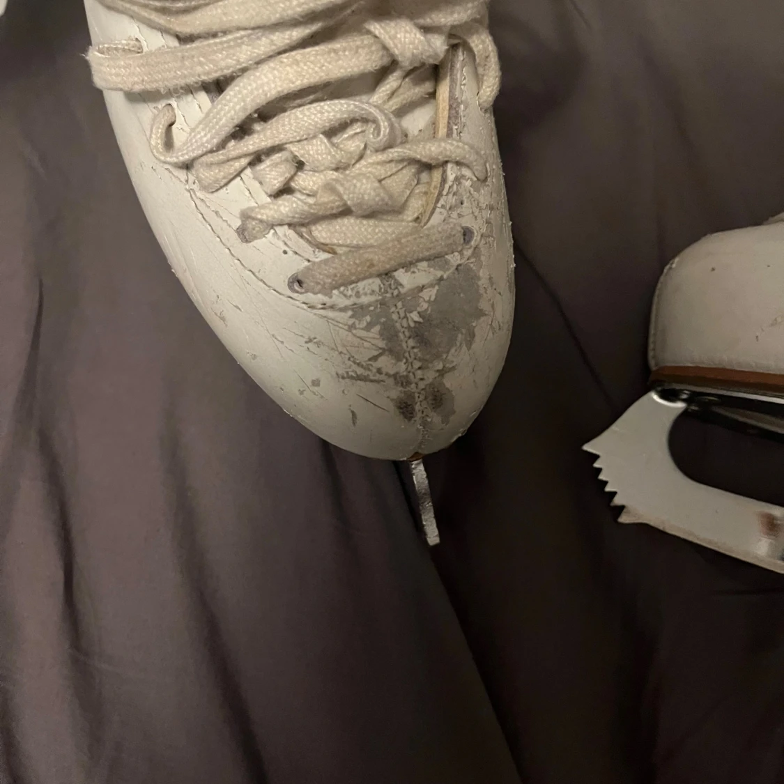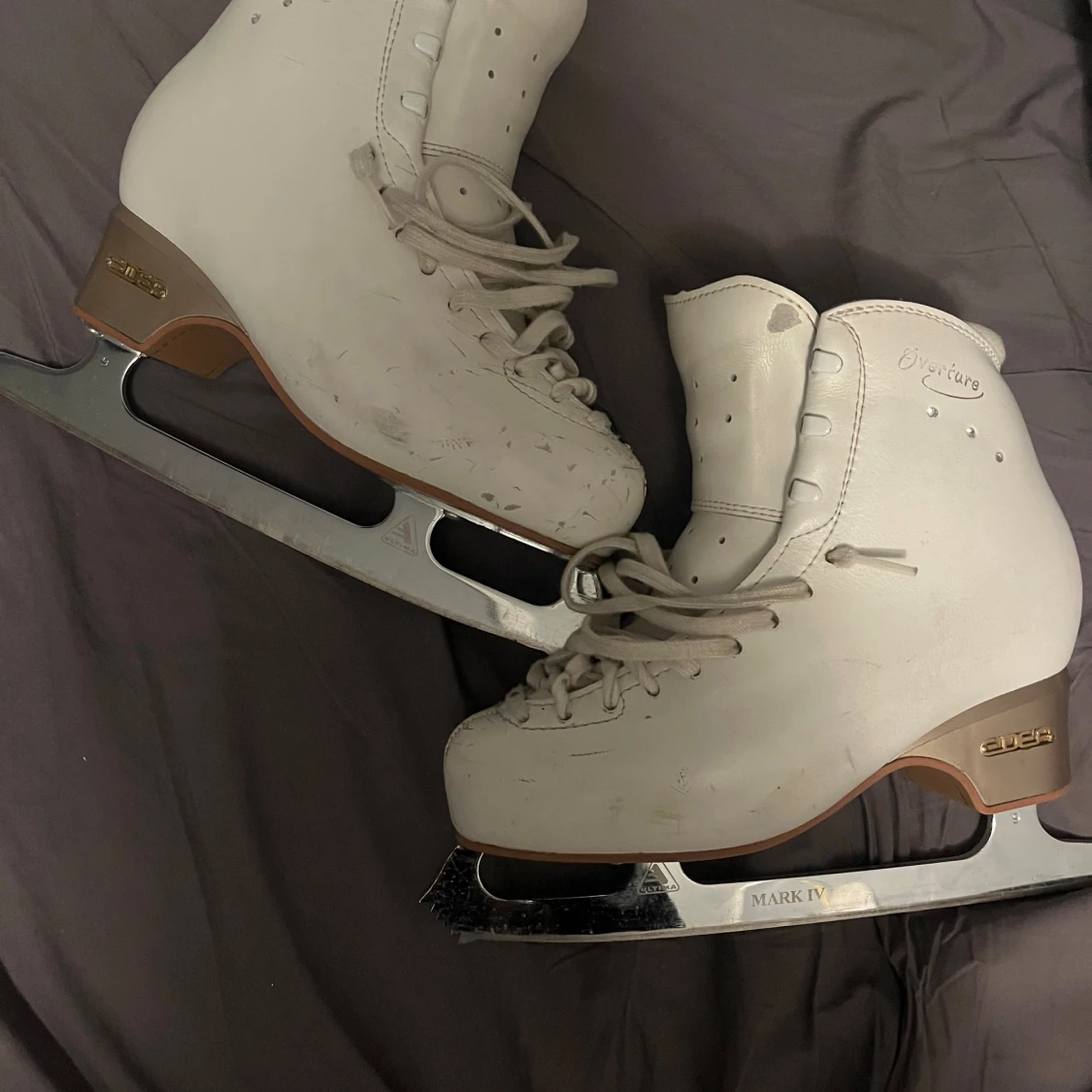 De är använda i 1,5 terminer och är storlek 240 som motsvarar ungefär storlek 37. De är ett par vita konståkningsskridskor från Overture med Mark IV Ultima skena.