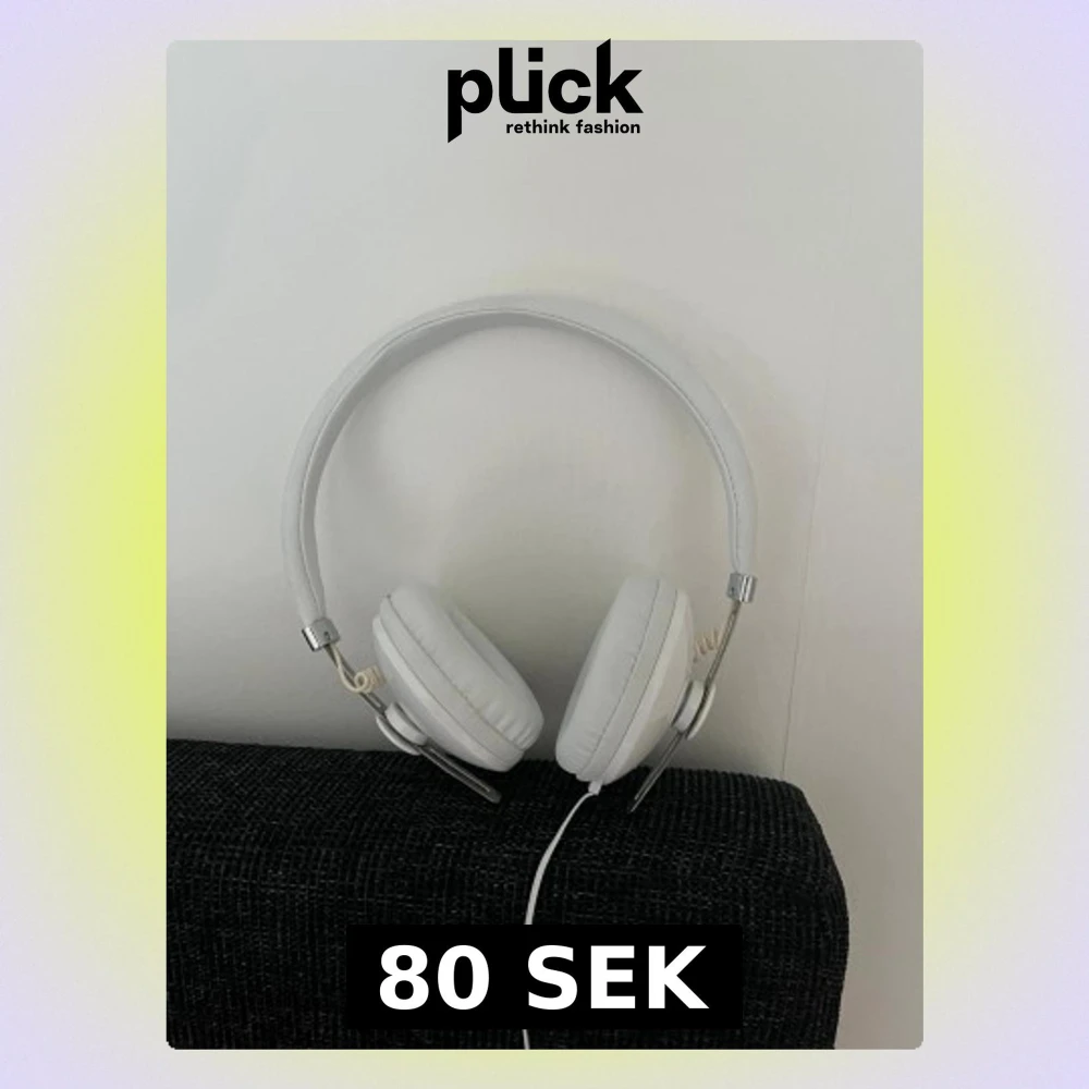 Stilrena vita over-ear hörlurar med kabel och 3,5 mm kontakt. Inbyggd mikrofon och fjärrkontroll på sladden. Mjuka öronkuddar för bekväm användning. Hörlurarna är i gott skick utan synligt slitage eller defekter.