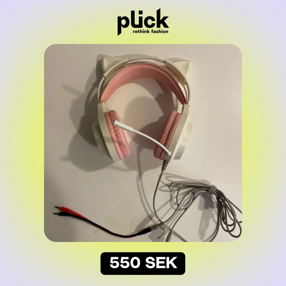 Hejsan jag säljer domma hörlurarna eftersom jag ej har användning för dom. Dom är helt oanvända och i bra skick. Kattöronen är av-plock-bara. Den lyser olika färger när den är inkopplad.