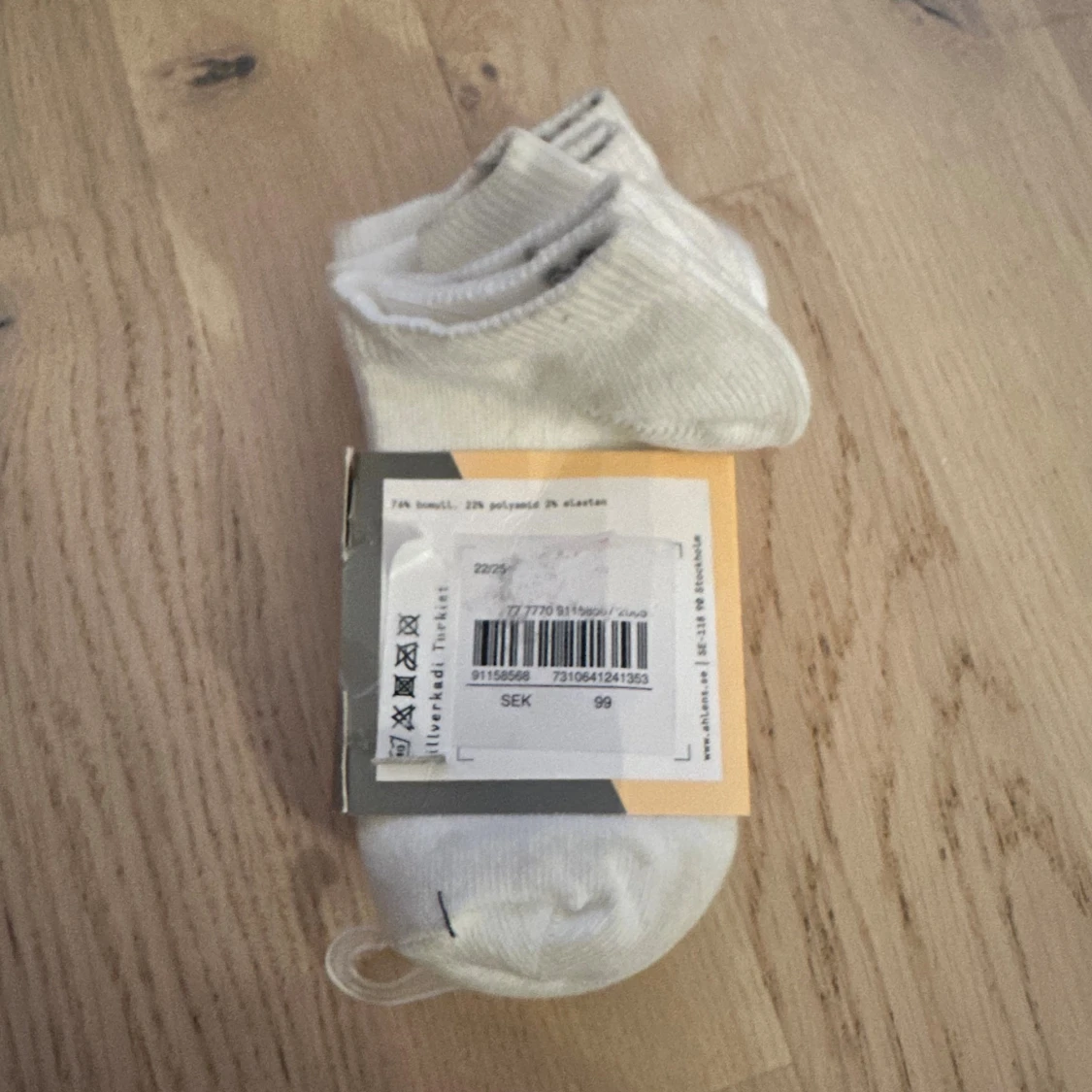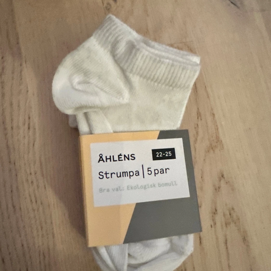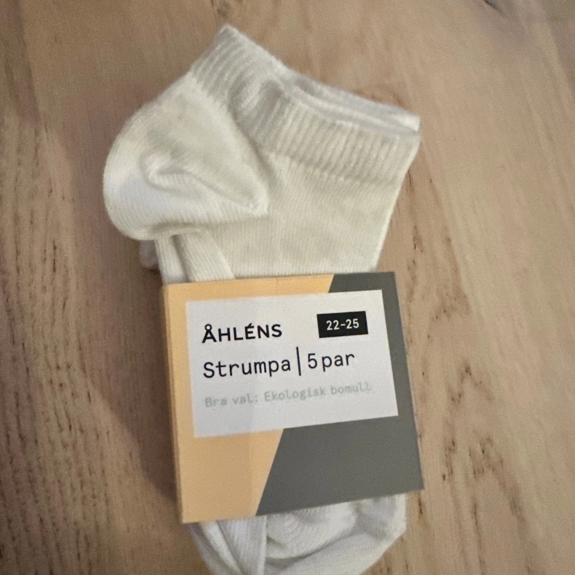 Ett paket med 5 par vita strumpor från Åhléns. Perfekt för barn. Fem par klassiska vita strumpor från Åhléns i storlek 22-25. Tillverkade av ekologisk bomull med inslag av polyester och elastan för extra komfort och stretch. Perfekt för dig som gillar enkla och stilrena strumpor till vardags.