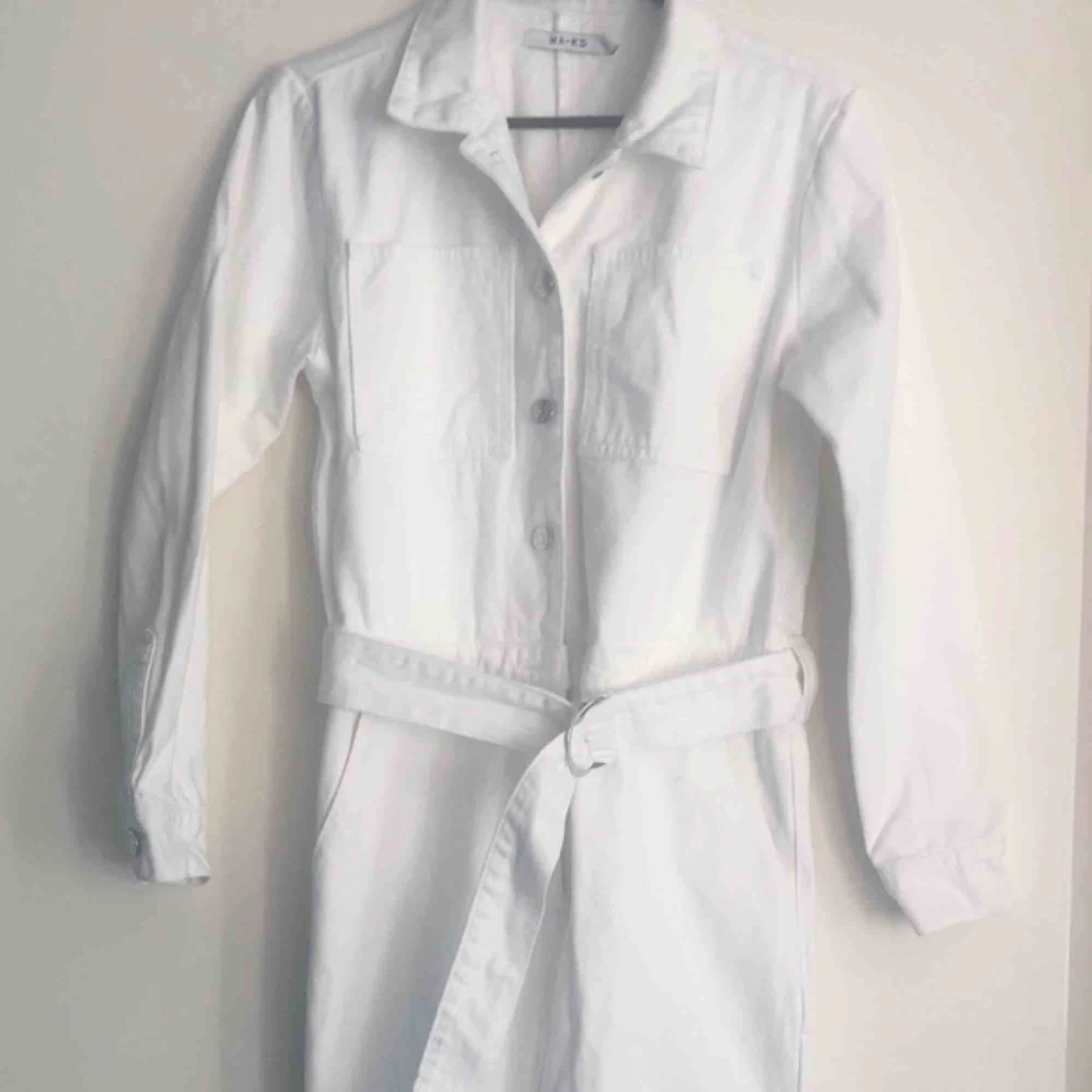 Märke: Na-kd Typ: byxdress Storlek: 38 Färg: vit denim Material: 100 % bomull Kroppstyp: kvinna Skick: nyskick, dock en liten missfärgning på bältet