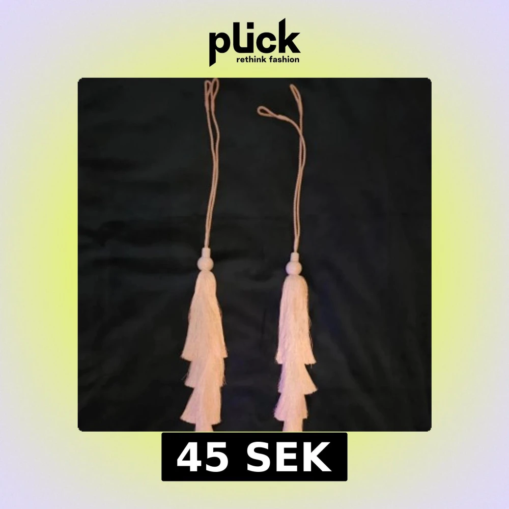 Säljer ett par snygga gardinbälten i vitt med långa, dekorativa tofsar och runda detaljer upptill. Perfekt för att ge gardinerna en lyxig och stilren look i rummet. Bältet är gjort av mjukt syntetmaterial och har en enkel knytning för att passa olika gardiner.