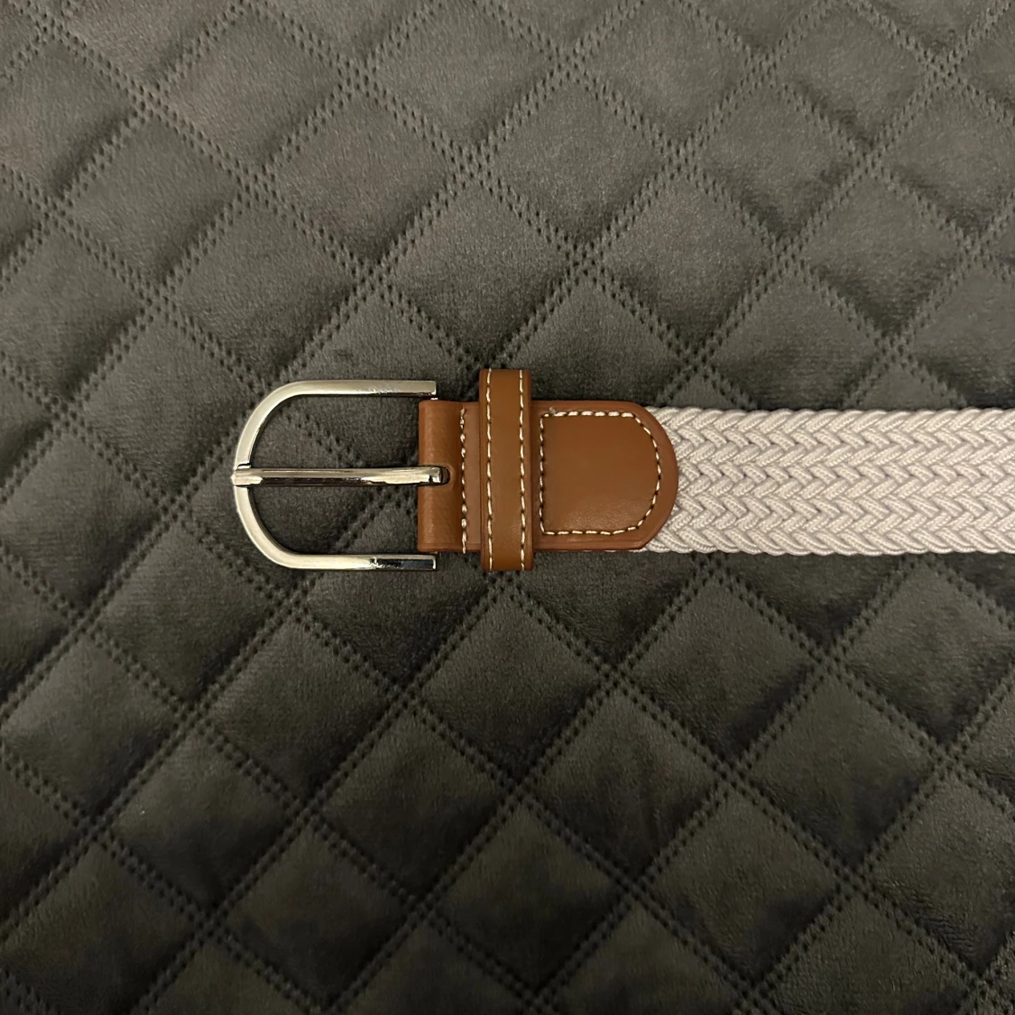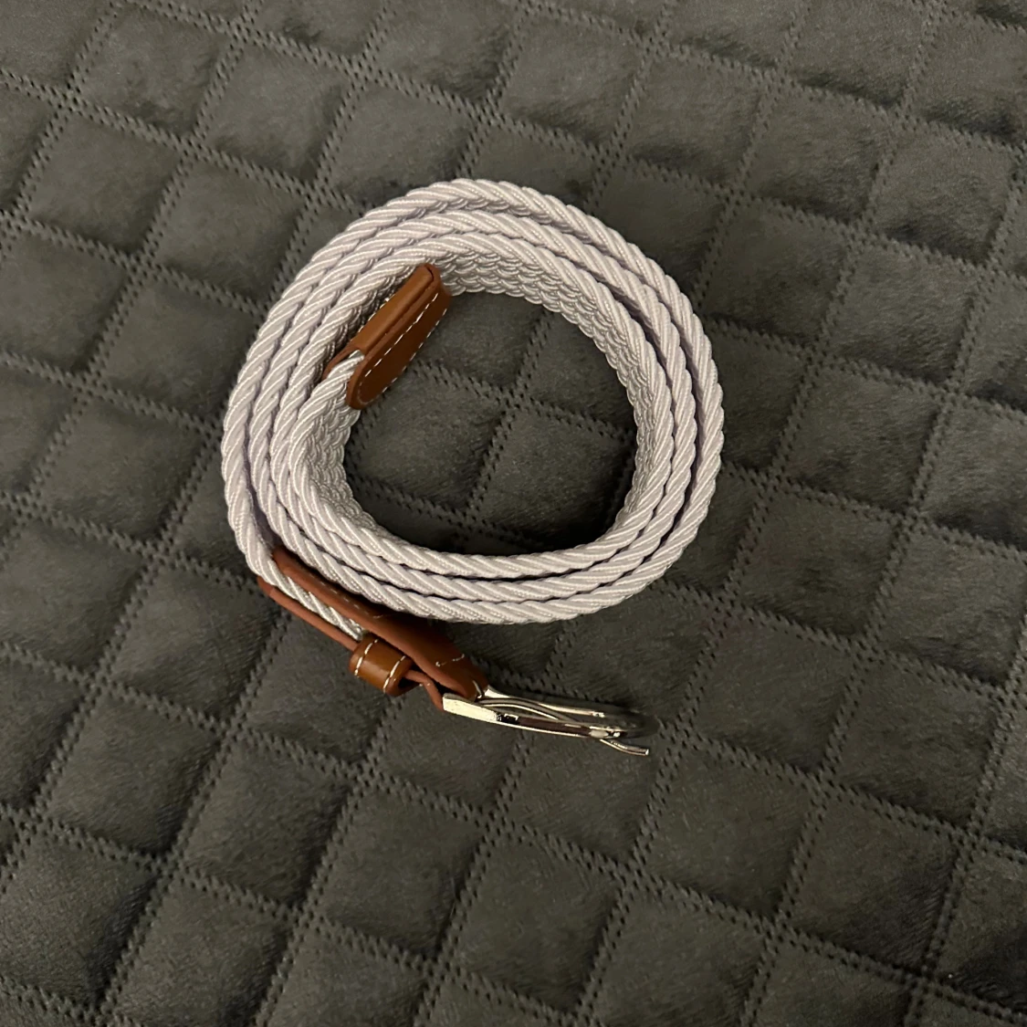 Snyggt vitt flätat bälte med bruna skinn-detaljer och silvrigt spänne. Bältet har en stilren design med tydliga sömmar på skinnpartierna och passar perfekt till jeans eller chinos. Flätad struktur ger en modern och fräsch känsla.