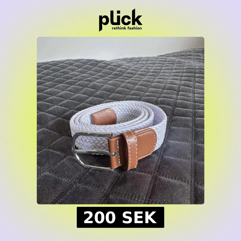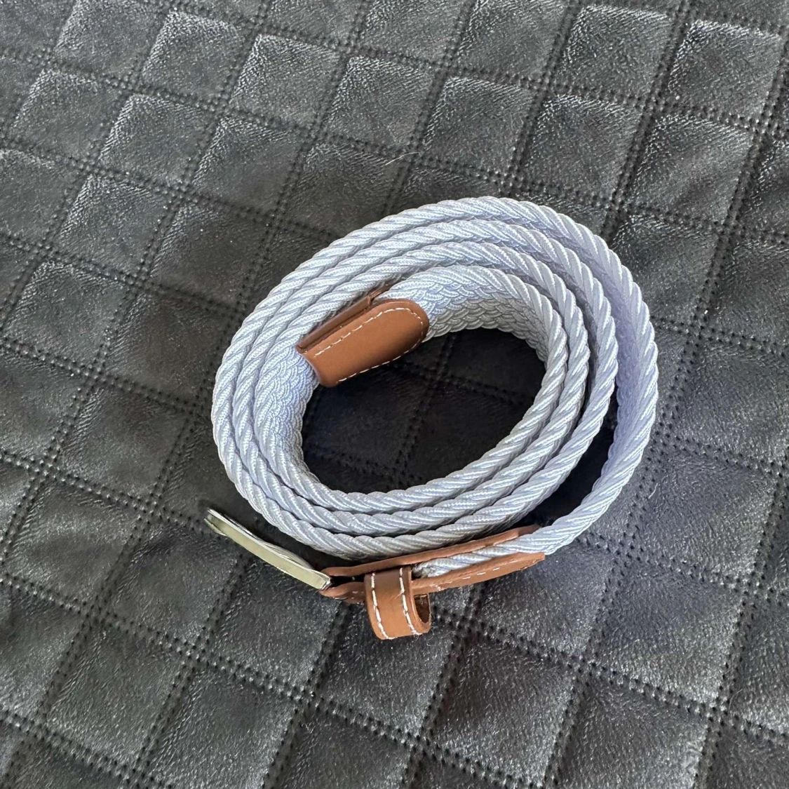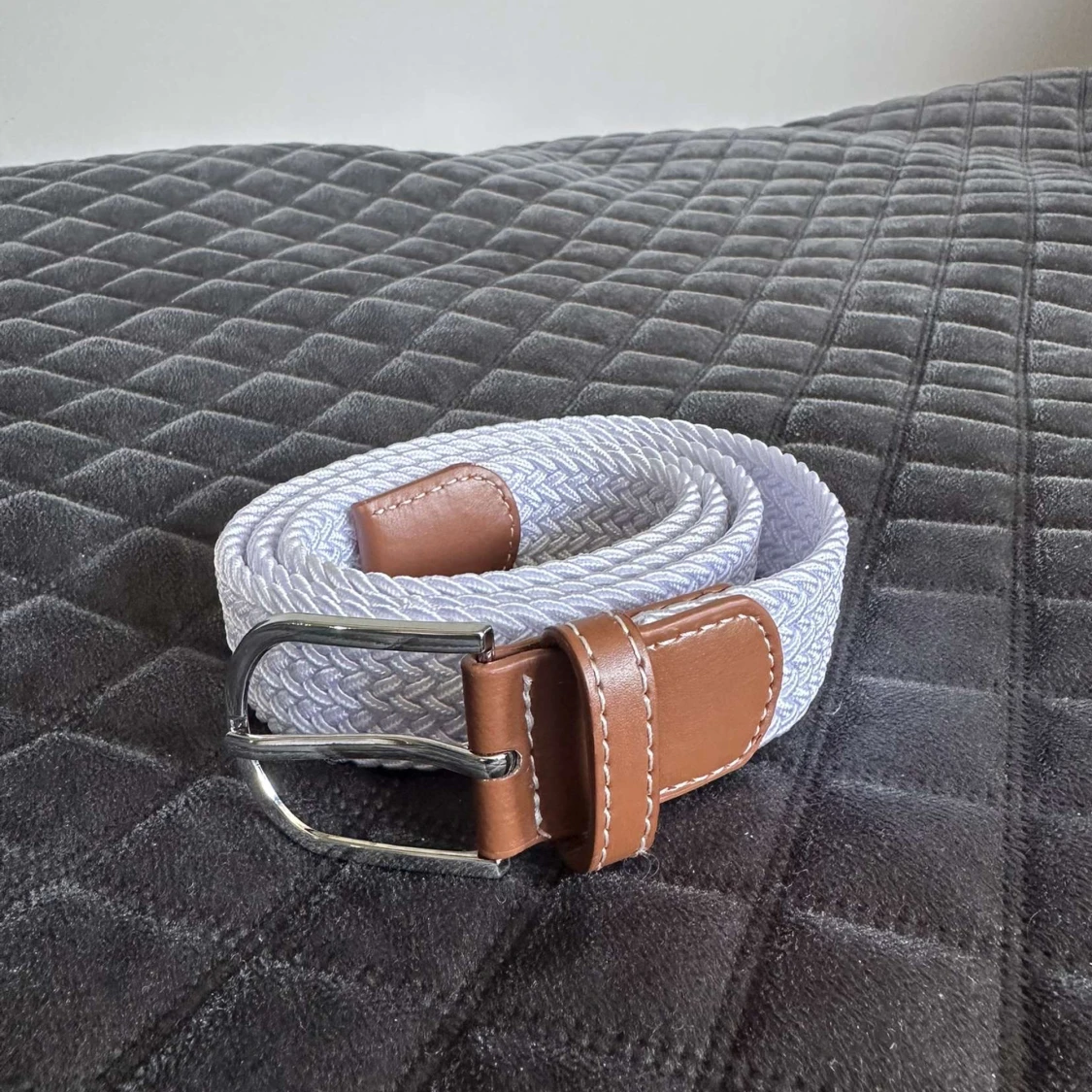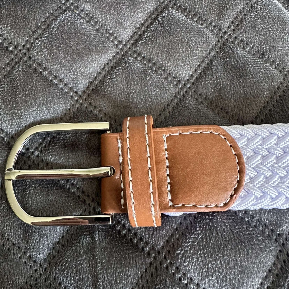 Snyggt vitt flätat bälte med detaljer i brunt skinn och silvrigt spänne. Bältet har en stilren look med vit söm längs skinnpartierna och passar perfekt till jeans eller chinos. Flexibelt material som gör det enkelt att justera efter önskad längd.Fungerar for storlekar över 95cm också.