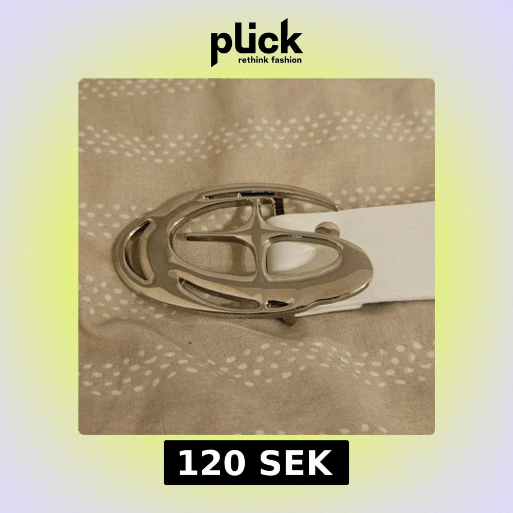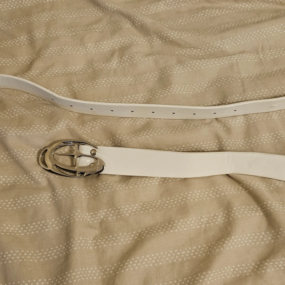 Snyggt vitt bälte med ett stort, ovalt silverfärgat spänne i metall. Bältet är stilrent och har flera hål för justerbar passform. Perfekt accessoar för att lyfta din outfit med en clean och modern look.