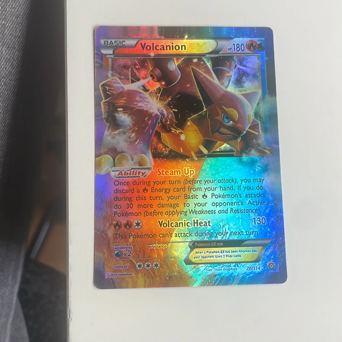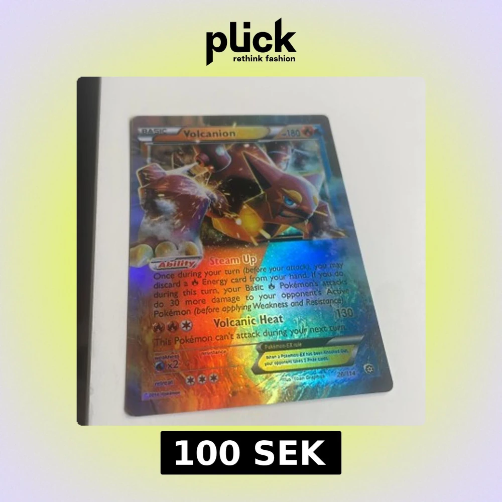 Cool och glittrig Volcanion EX Pokémonkort! Perfekt för samlare och spelare som vill boosta sitt deck med en kraftfull och unik kort. Kortet har snygg holo-effekt och är i fint skick. Ett måste för dig som älskar Pokémon och vill sticka ut i spelet!