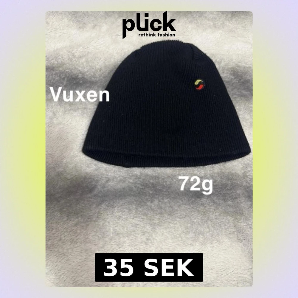 Svart stickad mössa med en liten rund logga i rött, gult och grönt på sidan. Enkel och stilren design som passar till det mesta.🌸 Några noppor. Storlek vuxen