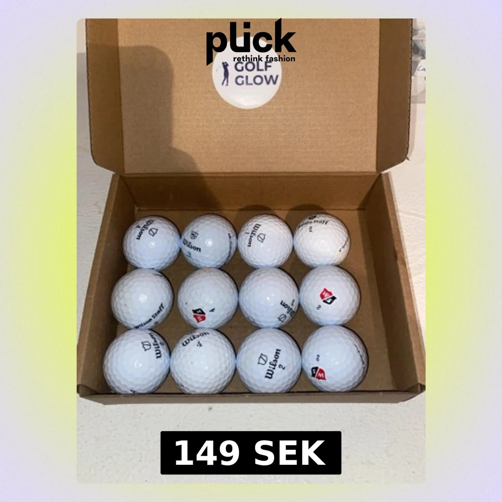 Säljer ett set med tolv vita golfbollar från Wilson, levererade i en brun kartong med Golf Glow-logga på locket. Bollarna har klassisk dimple-yta och märkning med Wilson Staff-logga samt siffror och symboler.
