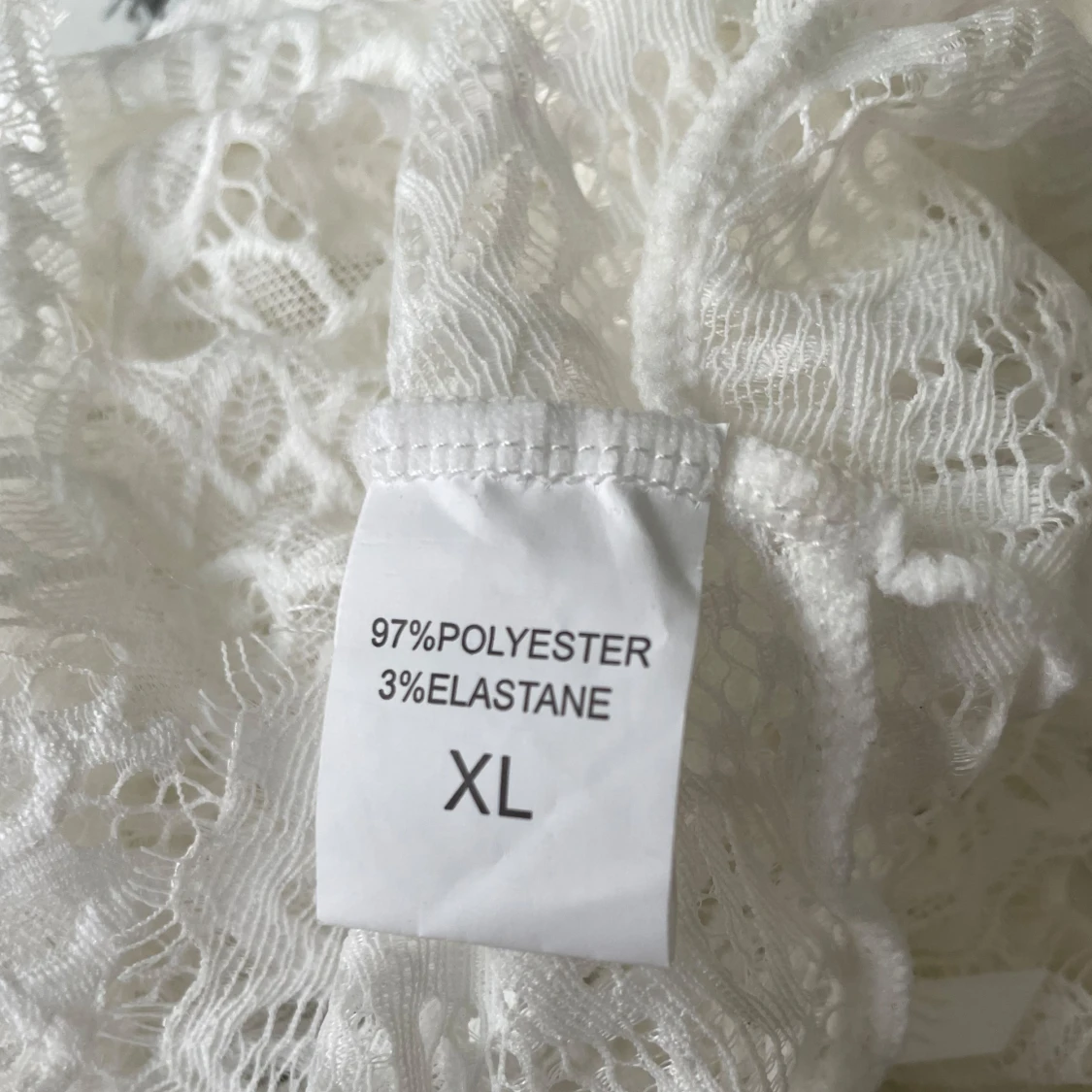 HELT NY! Säljer en vit, ärmlös bodysuit i spets med blommigt mönster och tunna axelband. Materialet är mjuk polyester med lite stretch för en tight passform. Perfekt för dig som vill ha en feminin och trendig look.