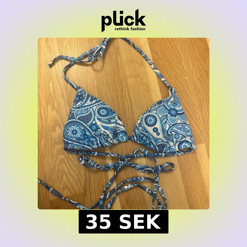 Snygg trekantsbikini i blått och vitt med paisleyinspirerat mönster och blommiga detaljer. Bikinin har smala knytband i nacken och ryggen för en justerbar passform. Perfekt för stranden eller poolen i sommar! Säljer en likadan fast i rosa, köper man de båda får man de för ett billigare pris.