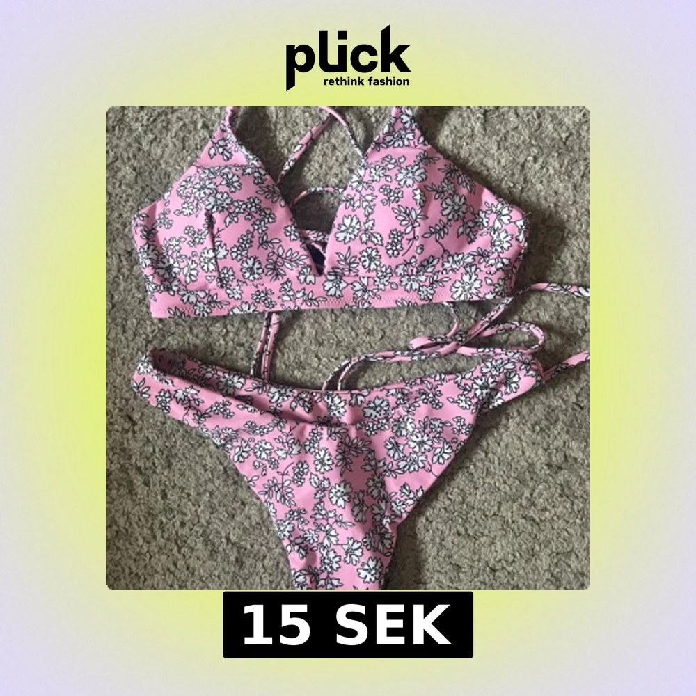 Superfin bikini i rosa med vitt blommönster och svarta konturer. Toppen har trekantsform och snygg snörning i ryggen som ger en cool detalj. Underdelen är klassisk med samma blommiga print. Perfekt för stranden eller poolen! Oanvänd såklart
