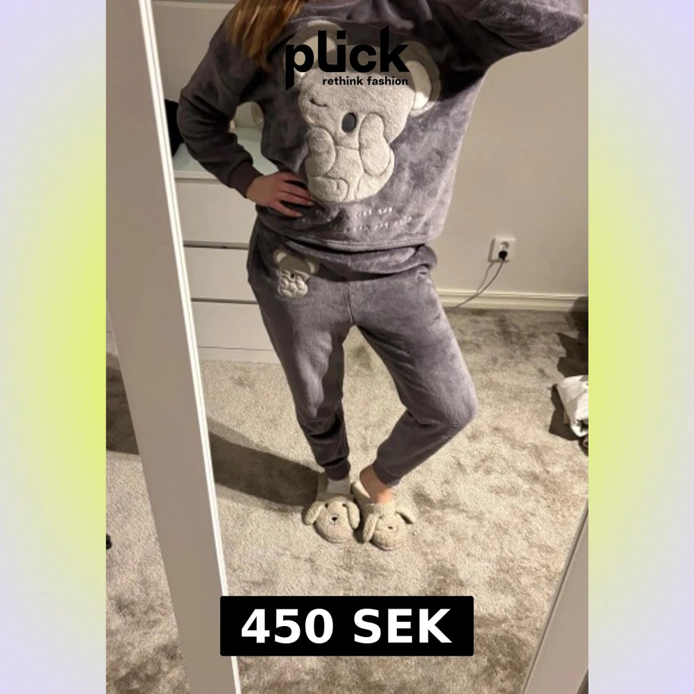 Supergosigt grått mjukissett från Oysho i storlek XS. Byxorna har ribbade muddar vid bensluten och ett sött koalamärke på höften. Materialet är fluffigt och mjukt, perfekt för chill hemma. Färgen är mörkgrå och passformen är loose.