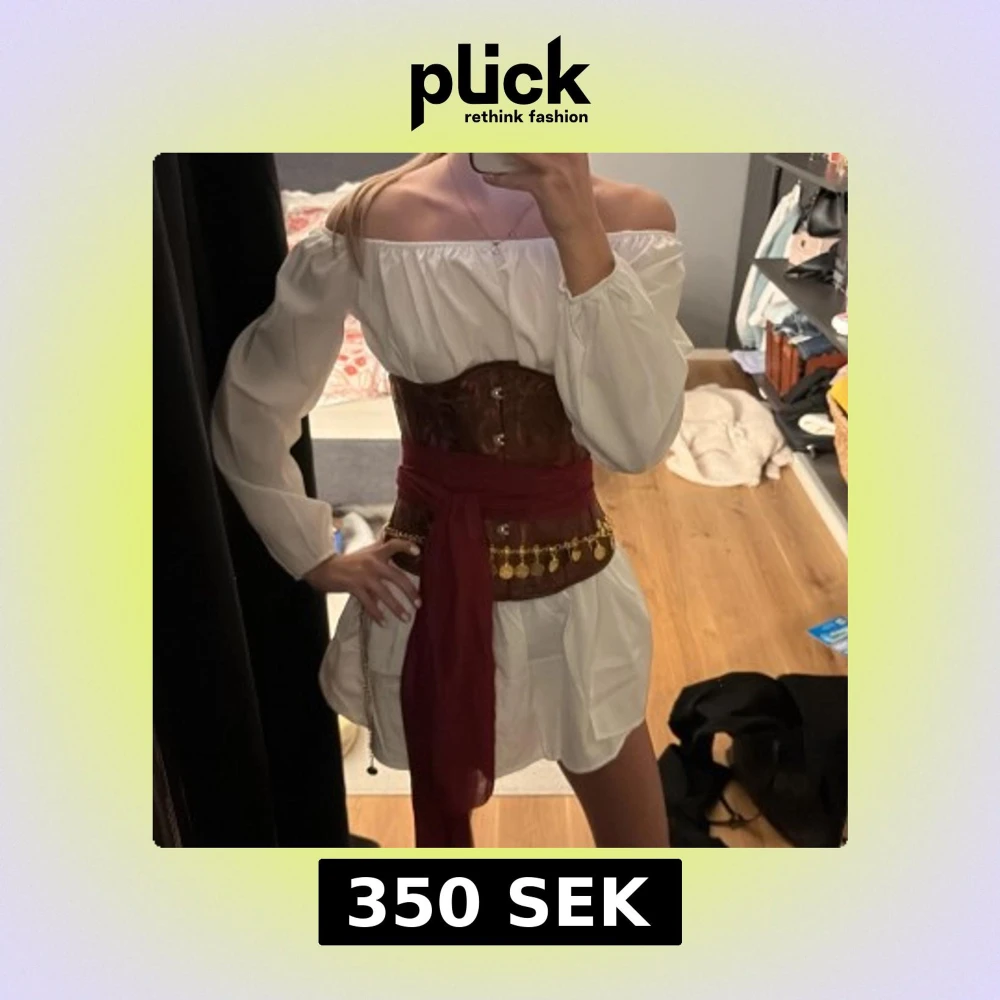 Säljer hela min pirat kostym då jag ångrade mig man får med en lång rad sjal guldbälte brun korsett ett sätt med en vit tröja och en vit kjol. Kjolen knyter du själv och sen Sånna saker du sätter i en fläta se på bild 2 (allt är i storlek xs) du kan bara köpa hela kostymen pris kan diskuteras men köpte allt för 550kr och postar direkt