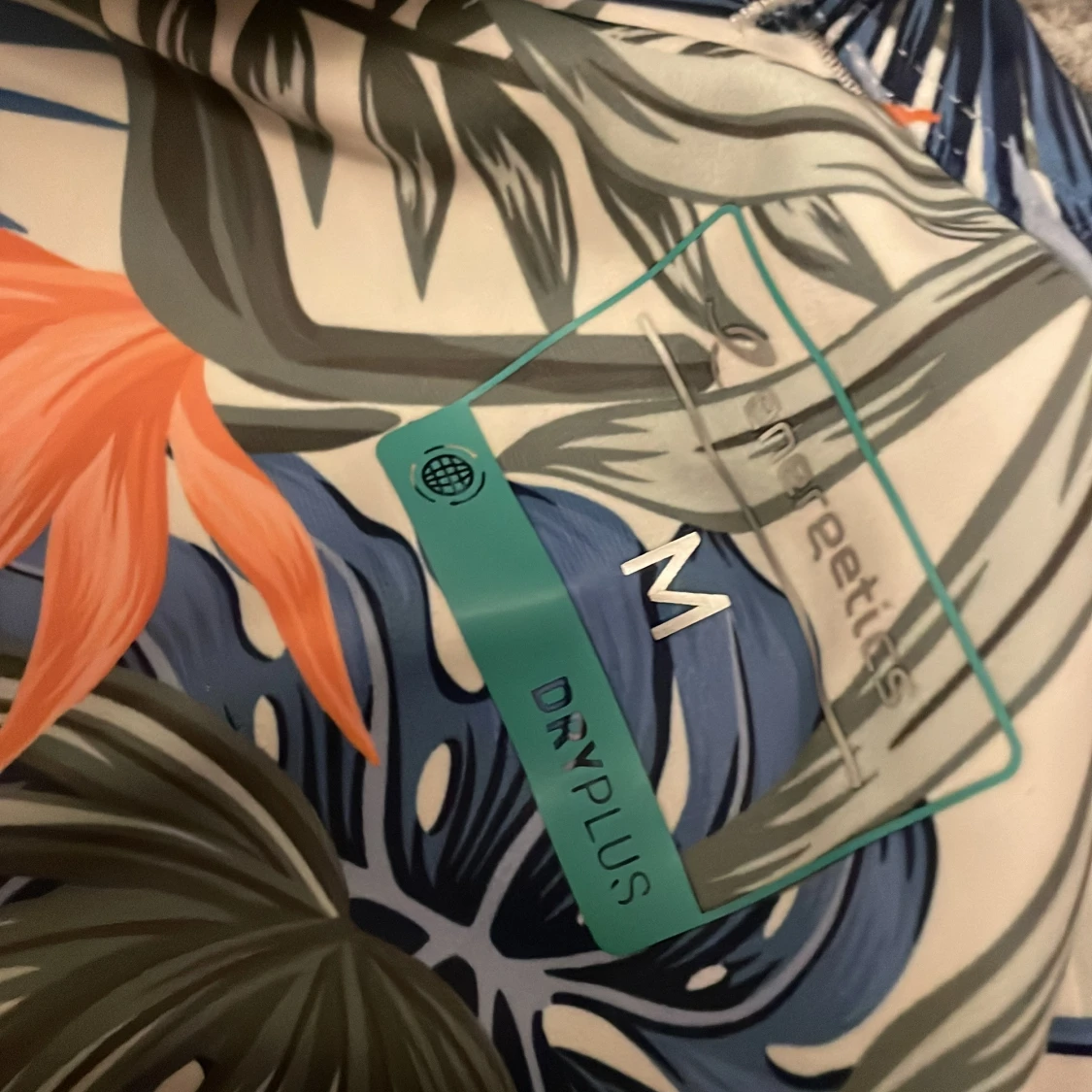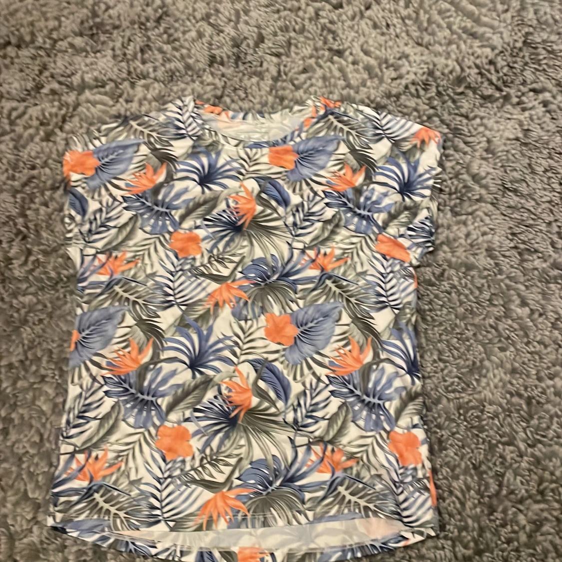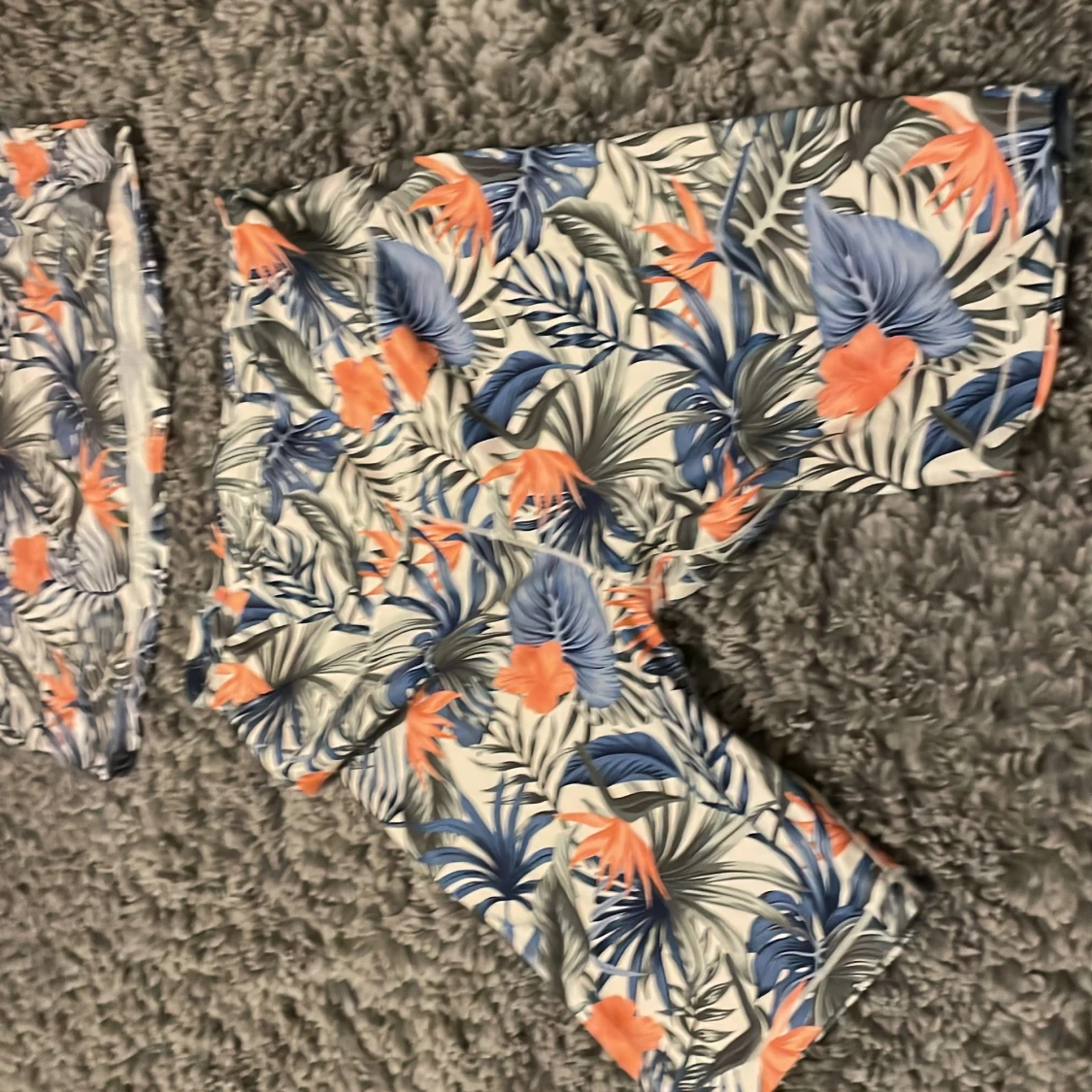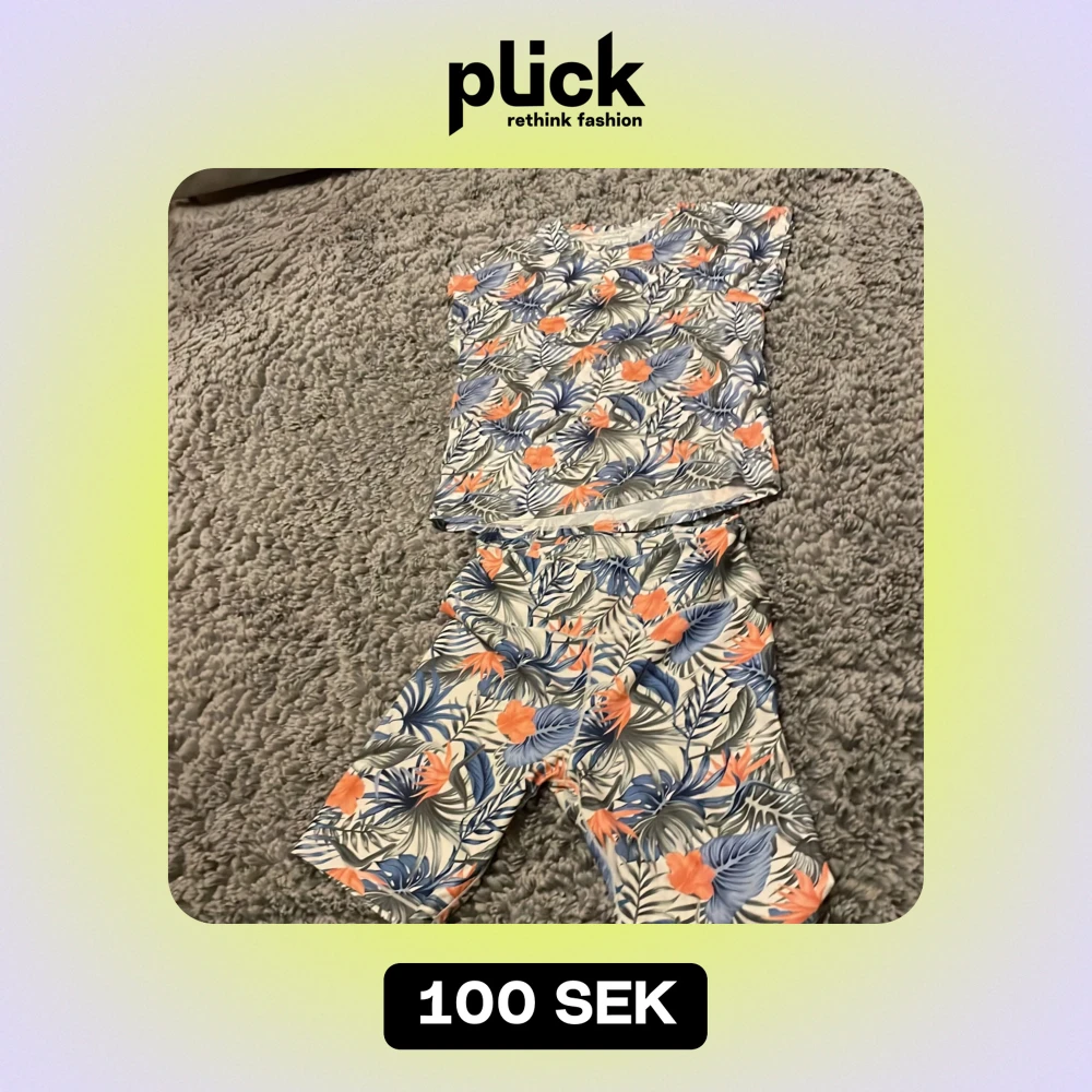 Snygga blommiga shorts och matchande topp i färgerna blå, orange och vit. Perfekt för sommarens äventyr med ett tropiskt mönster som sticker ut. Materialet är lätt och andas, vilket gör det idealiskt för varma dagar.Det är ett set som man kan njuta av i badrummet elelr annant är ett sätt badräkt