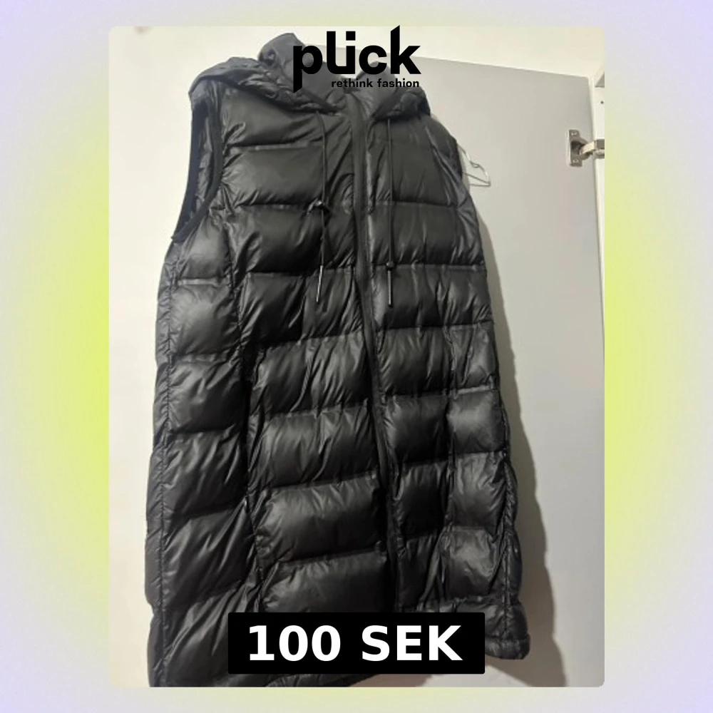 Säljer en svart lång dunväst med huva och dragsko. Västen har quiltad design, dragkedja framtill och är ärmlös. Perfekt för lager på lager och riktigt snygg till höst- och vinteroutfits.