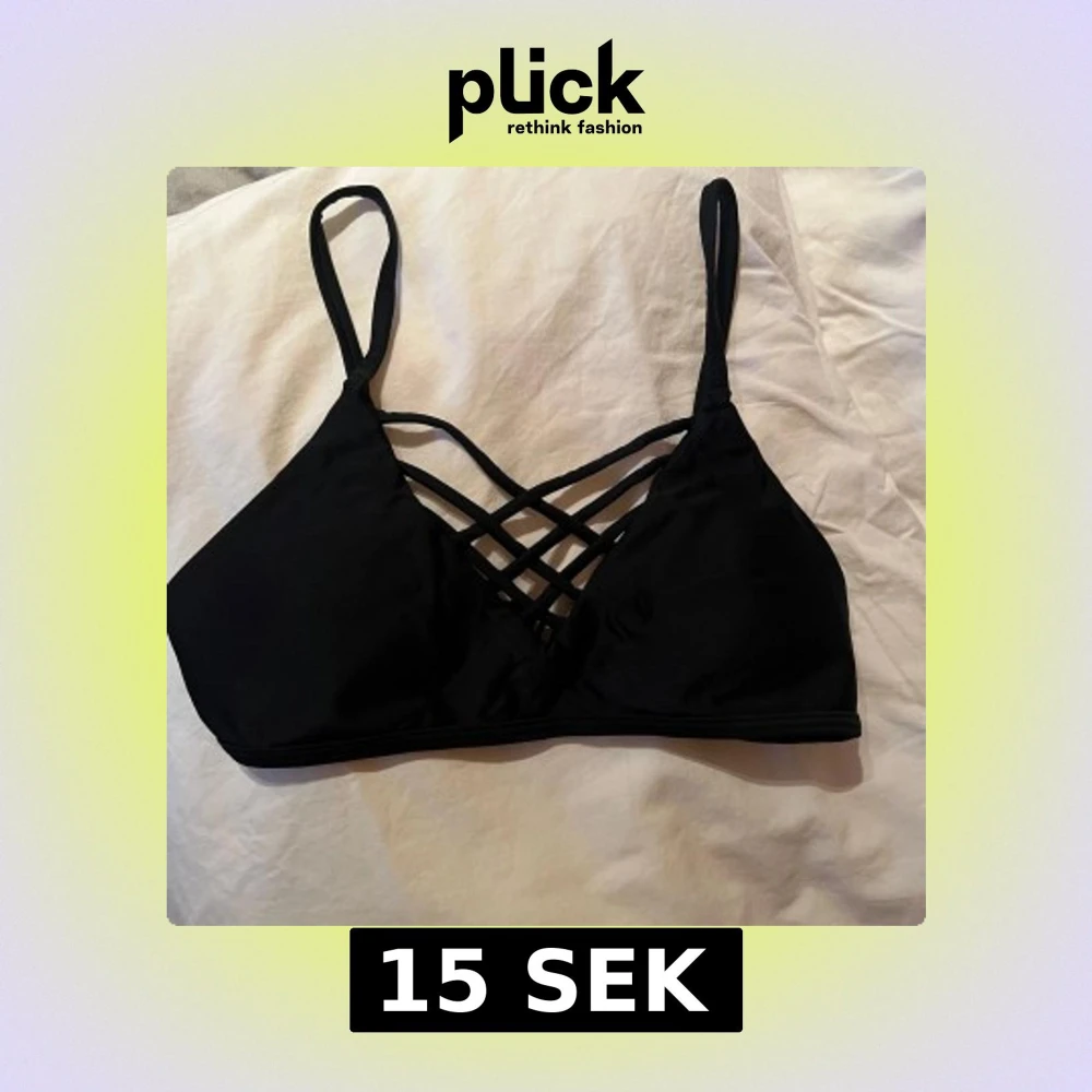 Snygg svart bikiniöverdel med korsade band framtill. Justerbara axelband och knäppning bak för perfekt passform. På 3e bilden syns det att jag fått fixa fästet till ena axelbandet