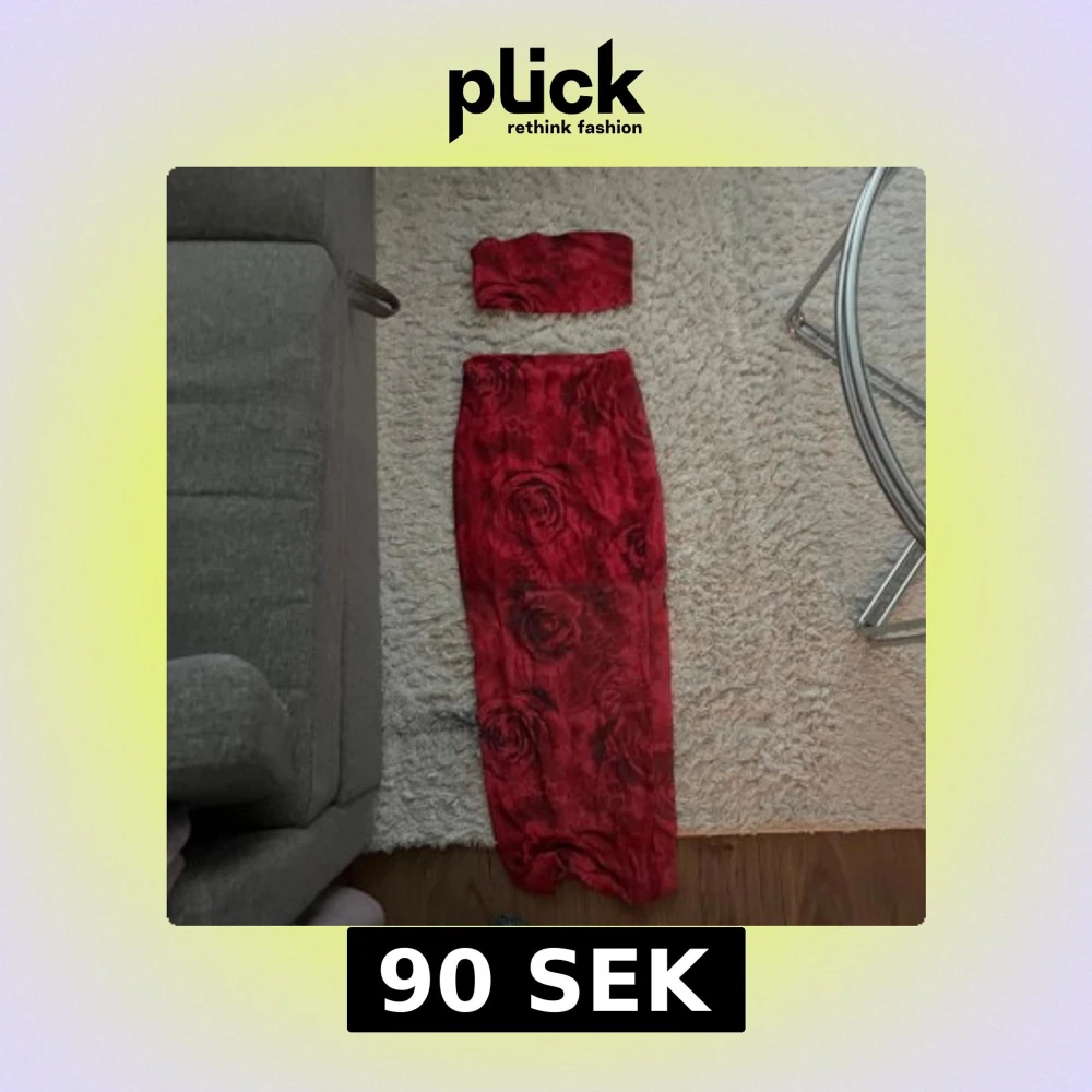 Säljer ett snyggt set med bandeau-topp och lång kjol i röd färg med rosigt blommigt mönster.🌸🌸