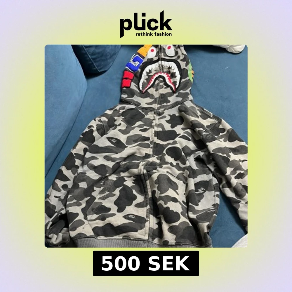 Säljer en cool camouflage hoodie från BAPE med ett hajmotiv på huvan. Den har en dragkedja framtill och färgglada detaljer på huvan. Perfekt för streetwear-stilen!