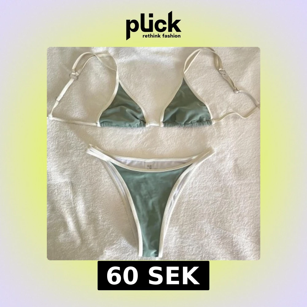 Trekantsbikini i grönt med vita kanter. Överdelen har justerbara axelband. Endast testad!