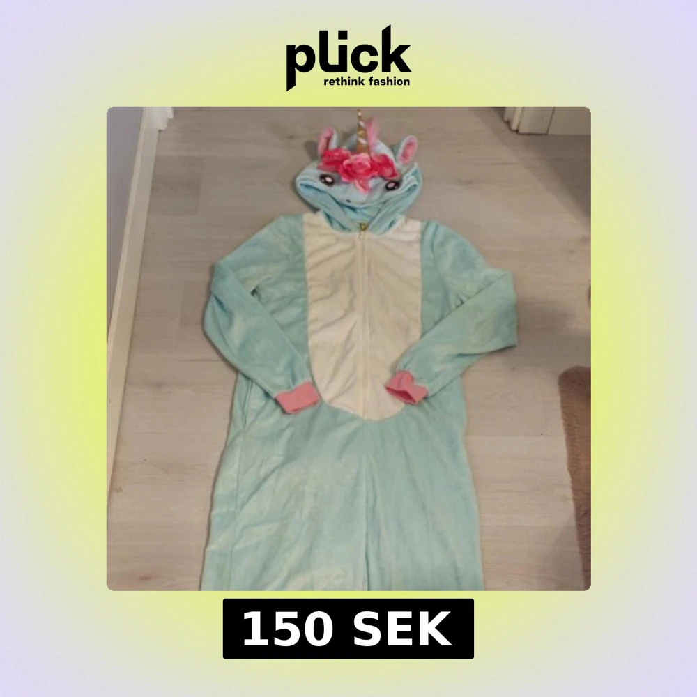 Supermysig mintgrönsblå unicorn onepiece med huva, guldigt horn, rosa blommor och öron. Dragkedja framtill, vita detaljer på magen, rosa muddar och fluffig rosa svans bak. Perfekt för dig som älskar enhörningar och vill sticka ut!