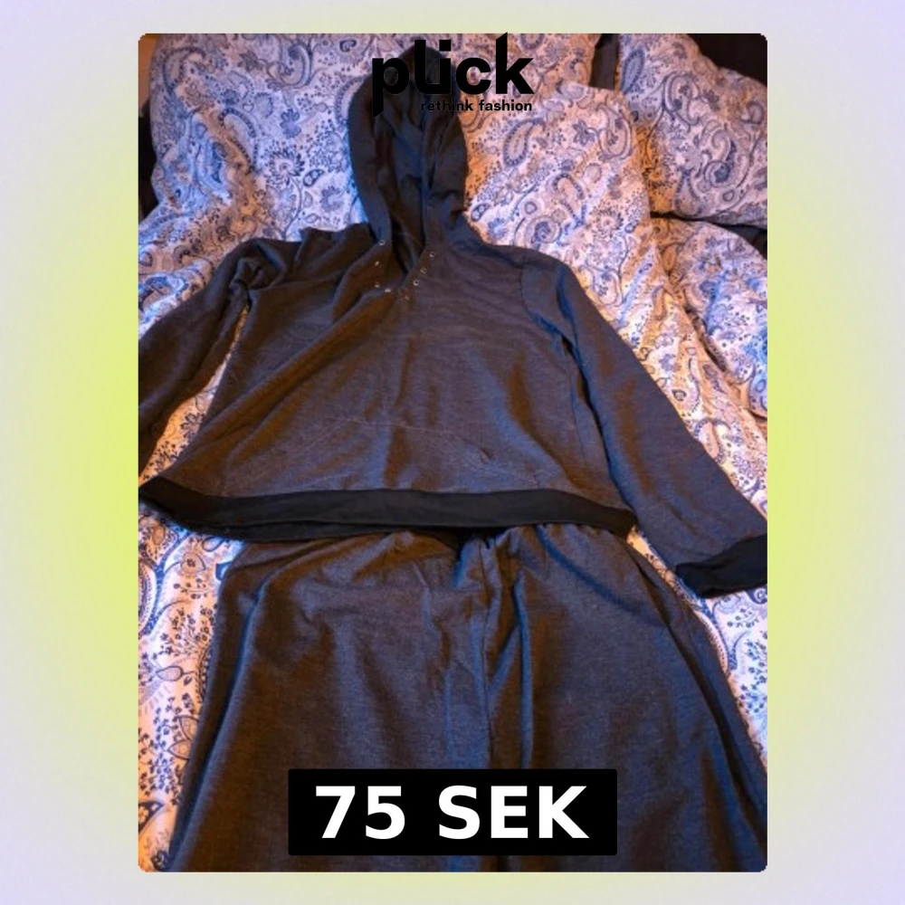 Mörkgrått loungewear-set i mjukt material med matchande tröja och byxor. Tröjan har huva, knappar vid halsen och svarta muddar. Byxorna har resår i midjan och muddar vid bensluten för extra komfort. Perfekt för chill hemma.