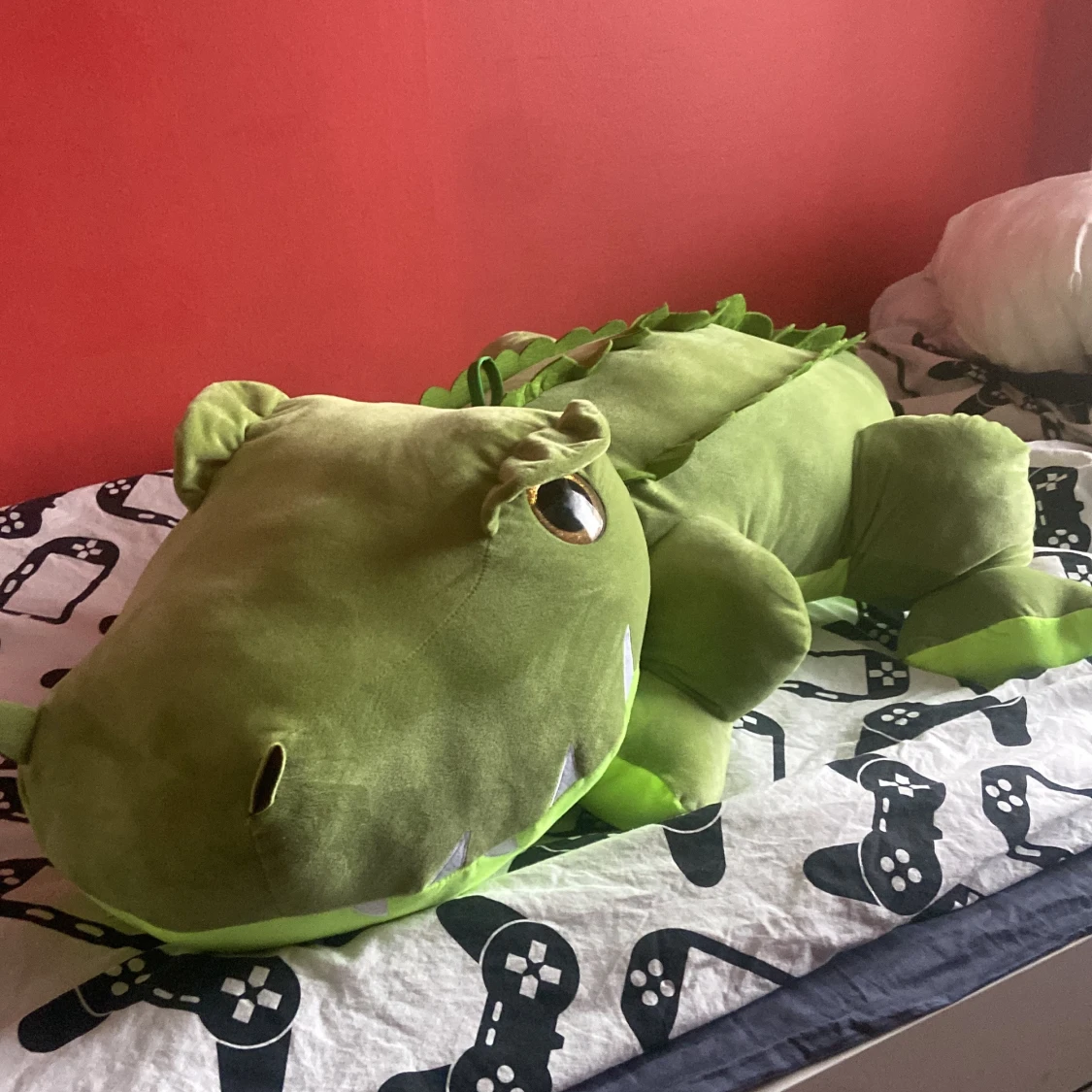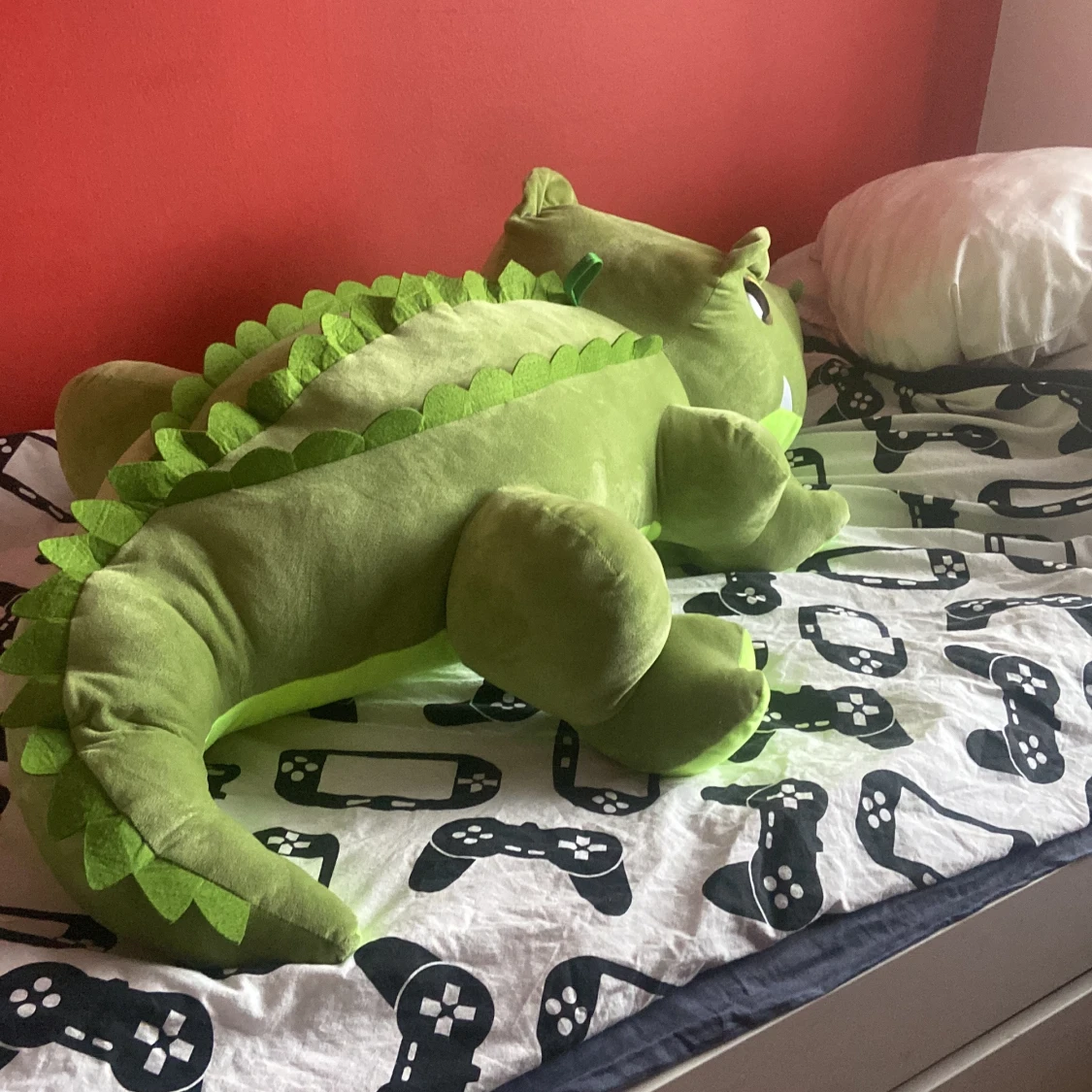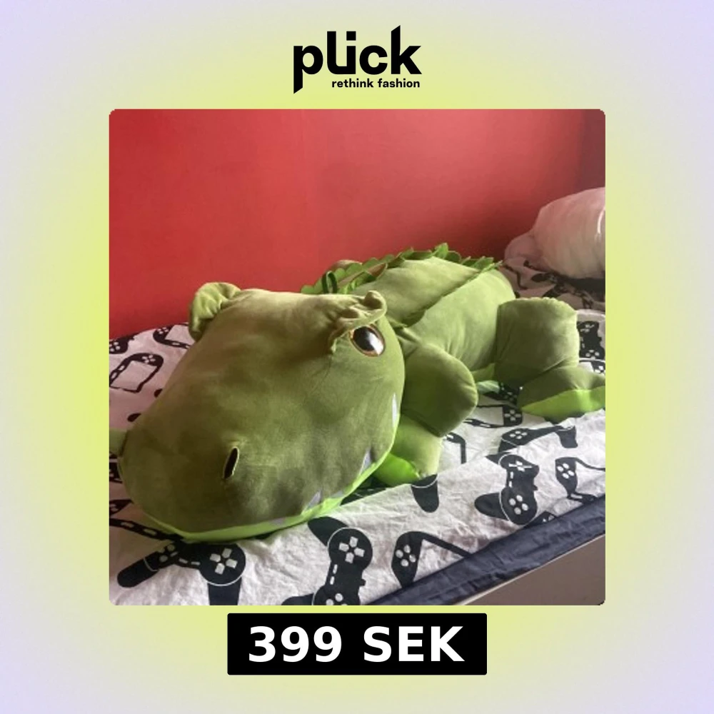 Ingen elektronikprodukt identifierad på bilderna. Bilderna visar en stor grön mjukisdjurskrokodil i gott skick, utan synliga defekter eller slitage. Produkten är en leksak och inte elektronik. 122cm lång.