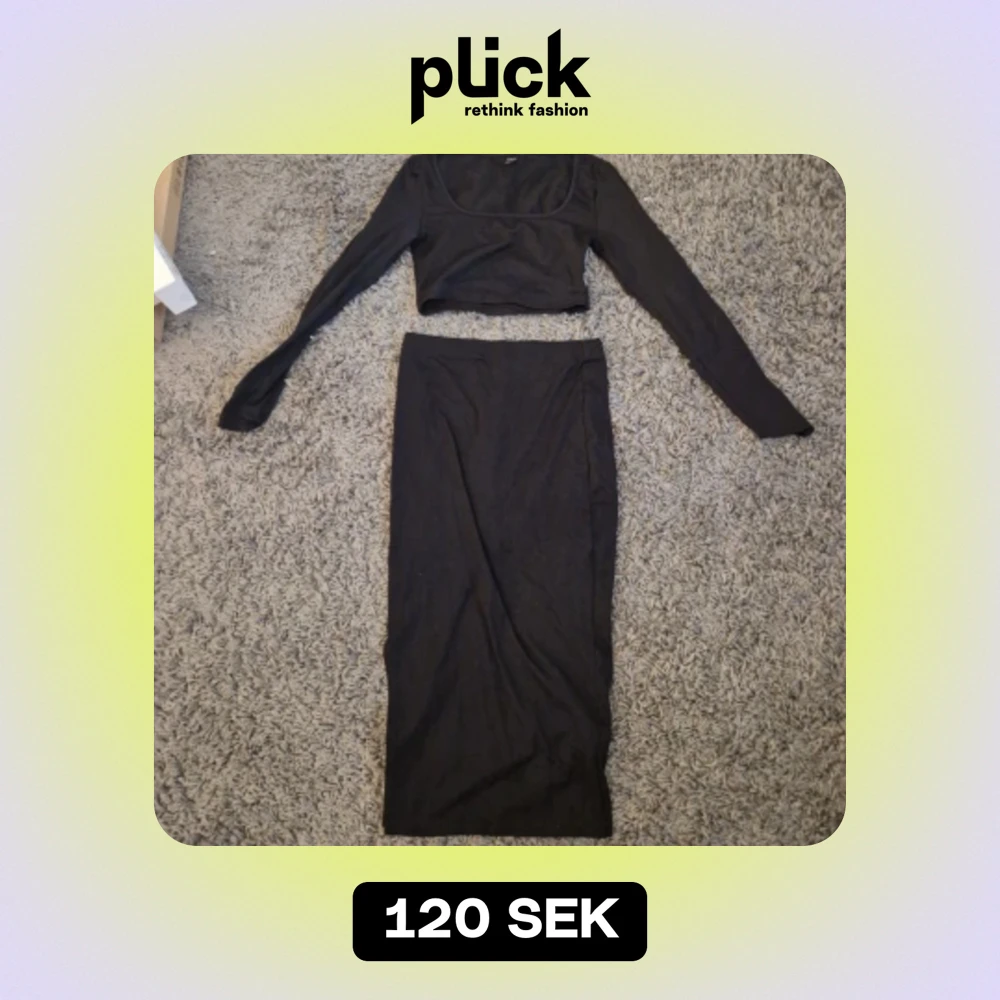 Svart set med lång kjol och långärmad cropped urringad topp! Kjolen har en kort slits. Supermaterial! Ribbat och stadigt, lite strech. Sparsamt använt (Bild 3 och 4 är exakt samma plagg bara annan färg för att man ska se hur det sitter på) 🤍