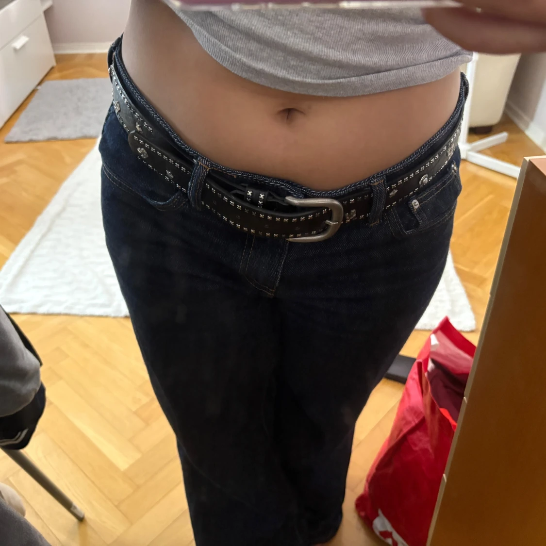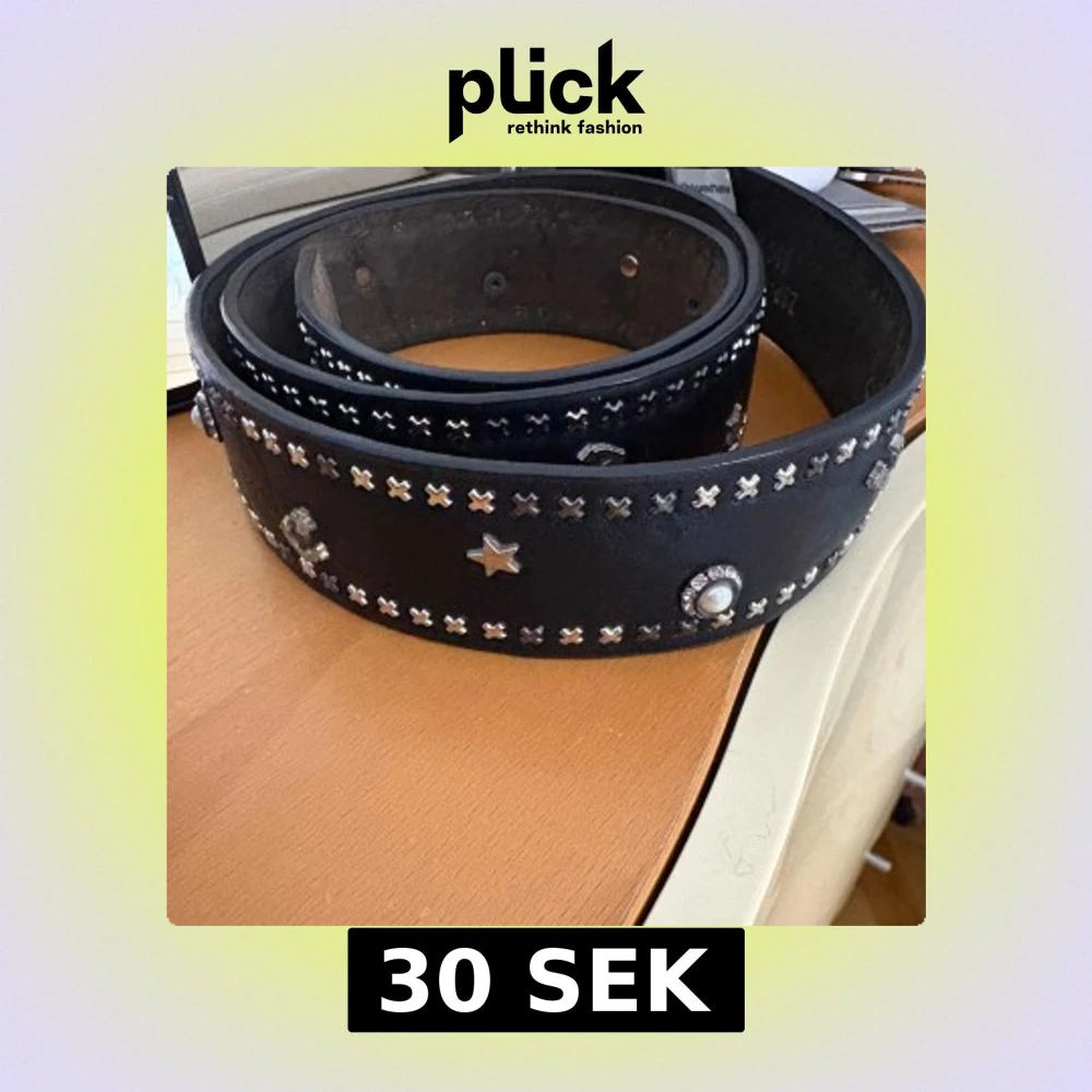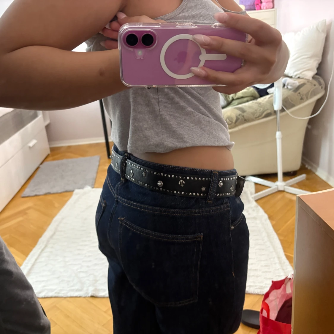 Säljer ett svart bälte med silvriga nitar och stjärnformade detaljer. Bältet har även runda dekorationer och passar perfekt till jeans. Snygg accessoar för att ge outfiten lite edge.
