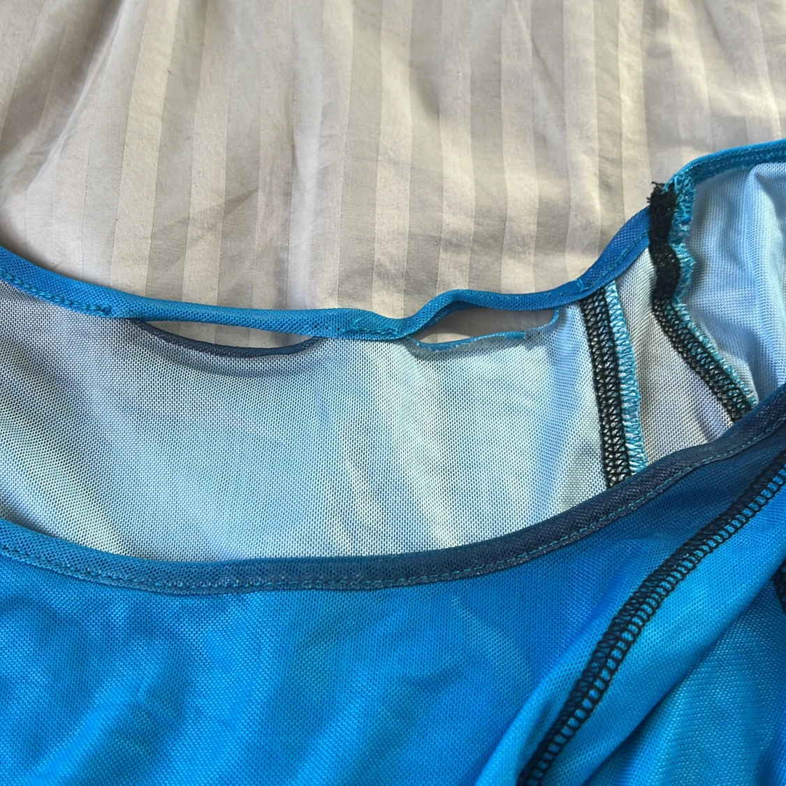 Säljer en blå och svart mesh topp och kjol med långa utsvängda ärmar och volangdetalj nertill. Toppen är croppad och har en asymmetrisk, edgy look med transparent material. Perfekt för dig som gillar statement-plagg och vill sticka ut. Båda delarna är i storlek L. Båda delarna är stretchiga. Nypris 199kr Tyvärr är toppen lite sönder på ryggen (se bilderna)