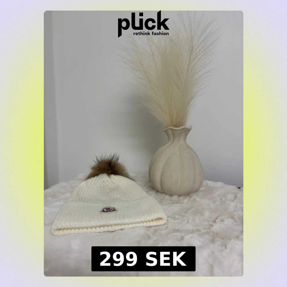 Ribbstickad vit mössa med stor brun pälsboll på toppen.. Mössan är mjuk och stretchig, perfekt för kalla dagar. Snygg och enkel design som ger en clean look.