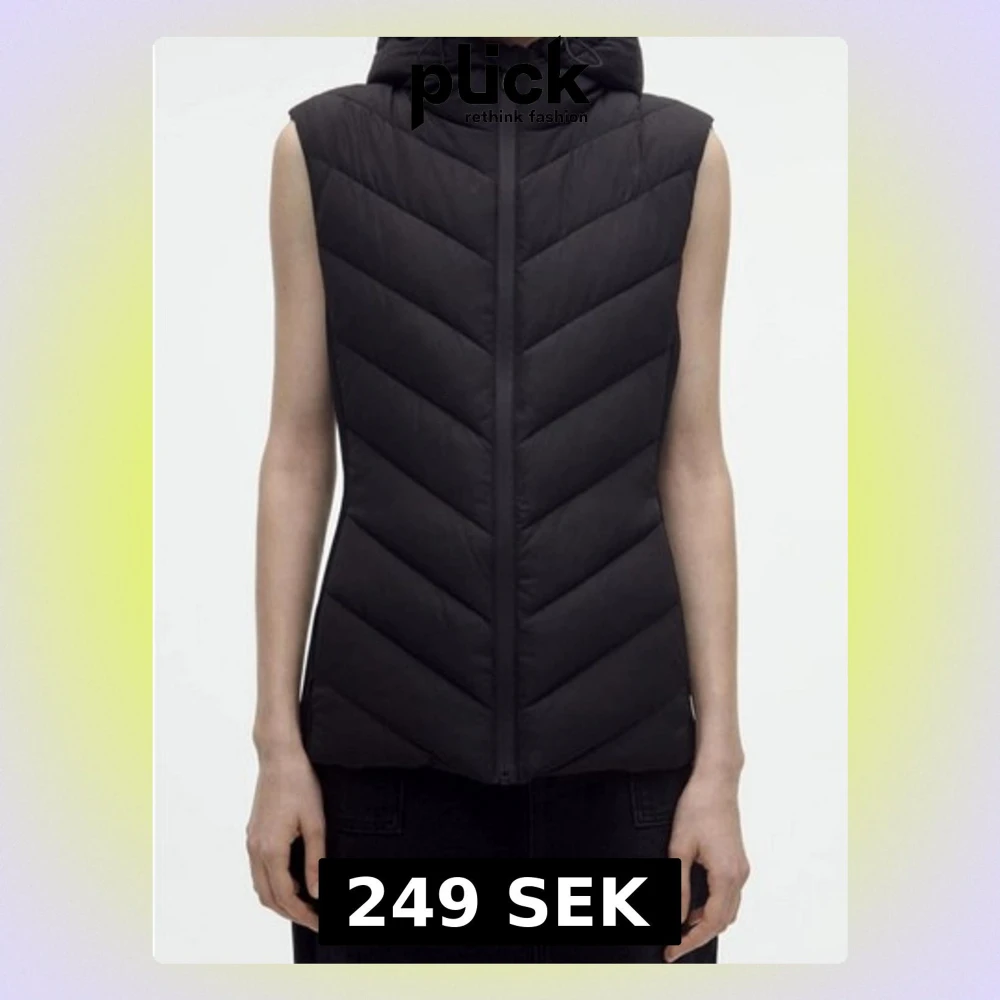 Snygg svart dunväst med huva o dragkedja framtill. Västen har ett modernt, vadderat mönster i chevron-stil o är figurnära i modellen. Använd fåtal gånger så bra skick.