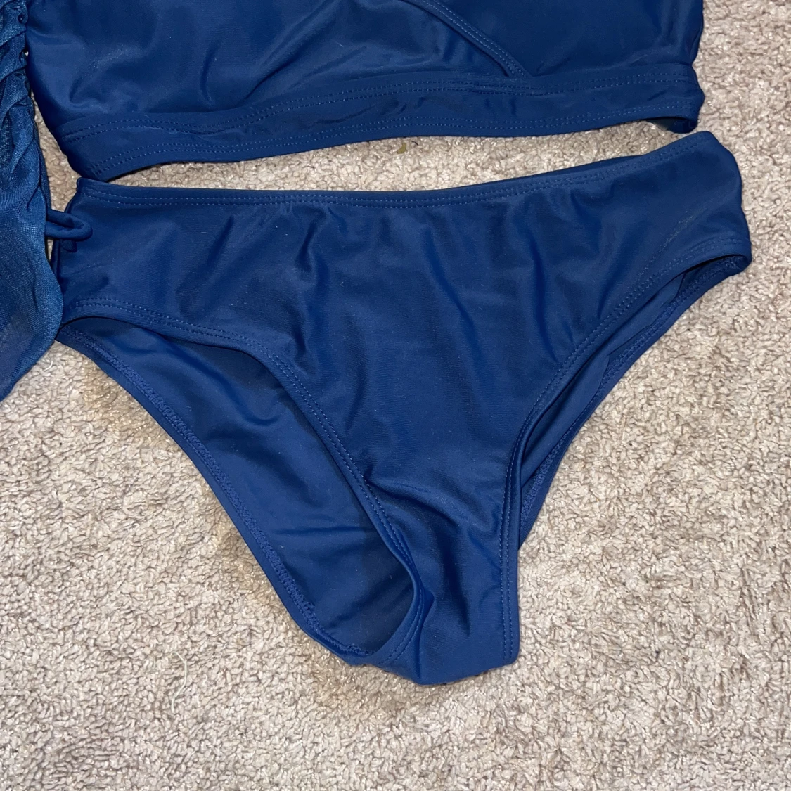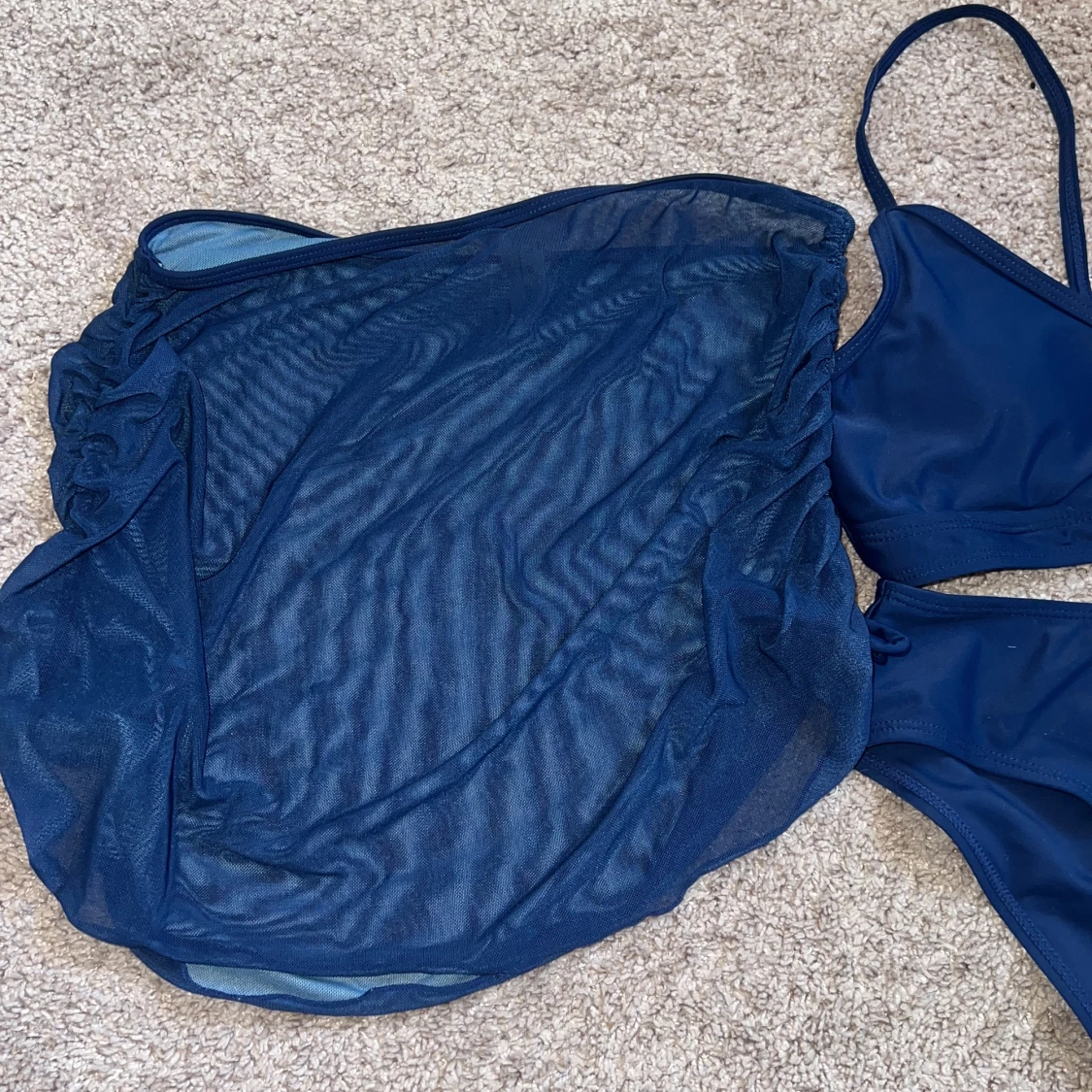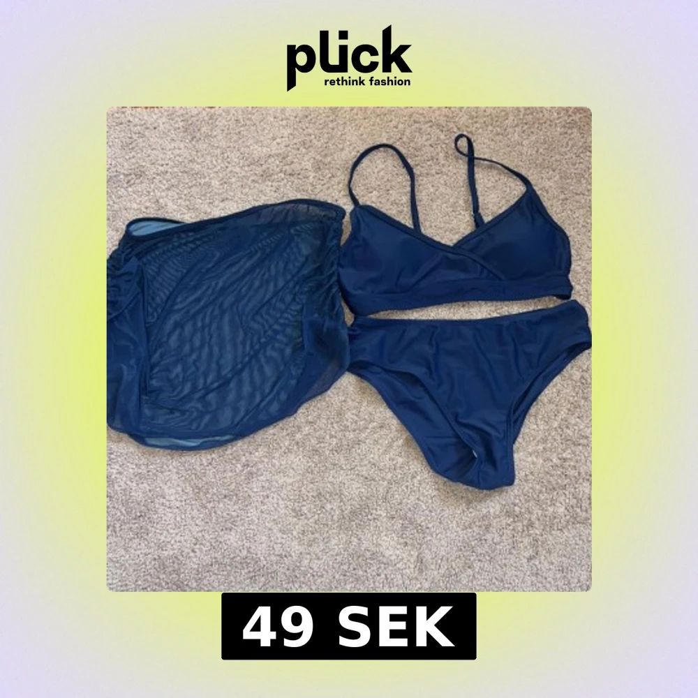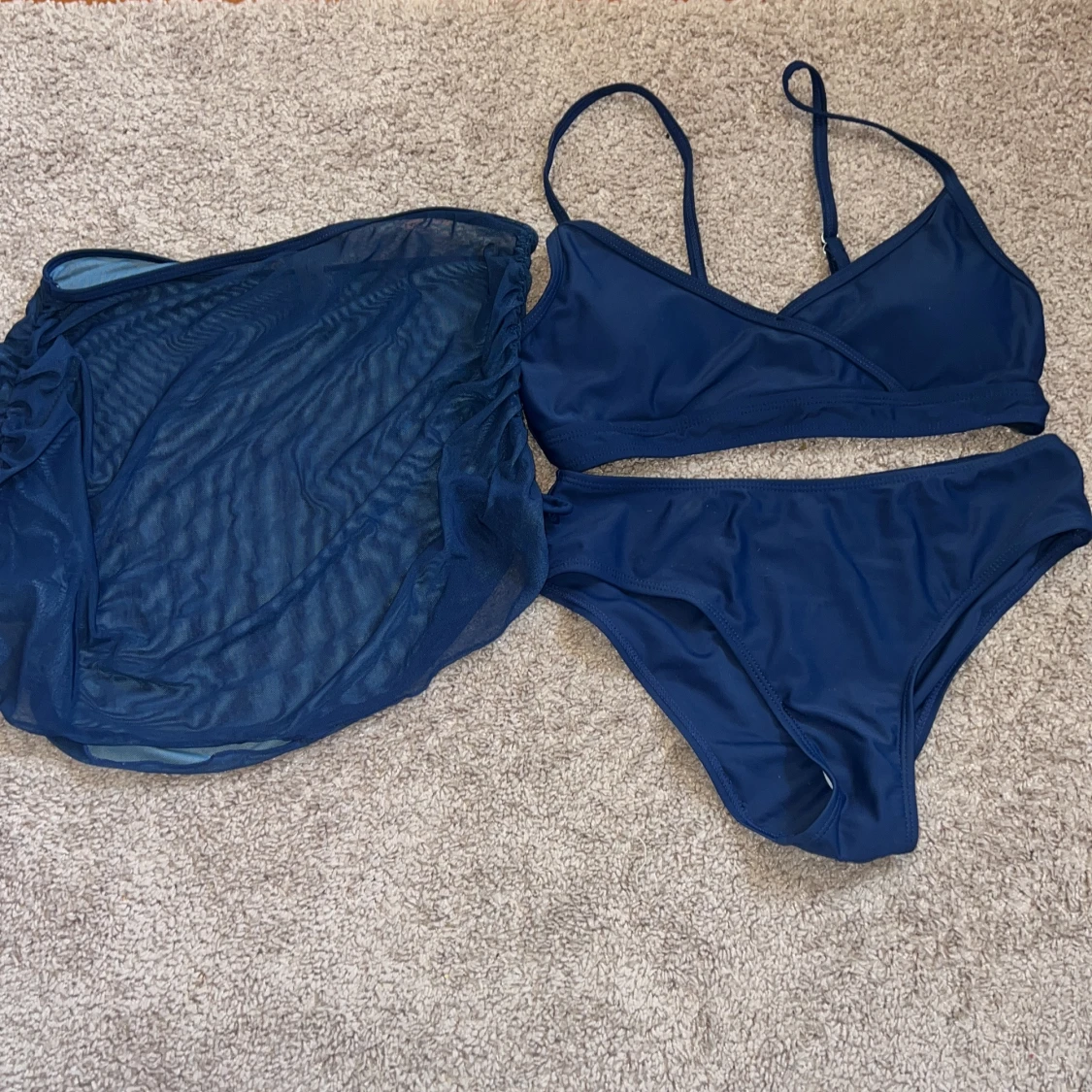 Snygg marinblå bikini med omlott-topp och smala axelband. Matchande bikiniunderdel i samma färg och en transparent meshkjol som ger extra stil på stranden. Perfekt för dig som vill ha en enkel men trendig look i sommar.