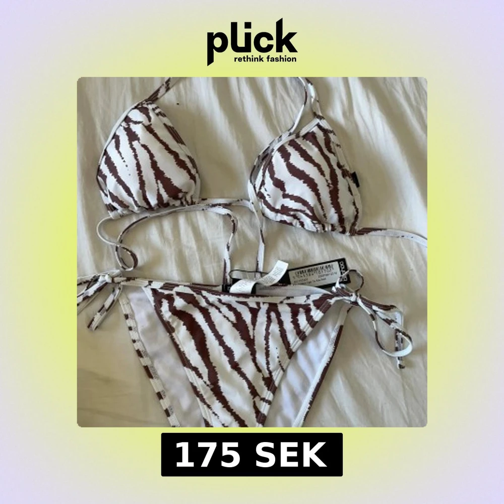 Snygg bikini från Boohoo med zebramönster i brunt och vitt. Överdelen har justerbara band och knytning i nacken, medan underdelen har knytband på sidorna för perfekt passform. Perfekt för en dag på stranden eller vid poolen!